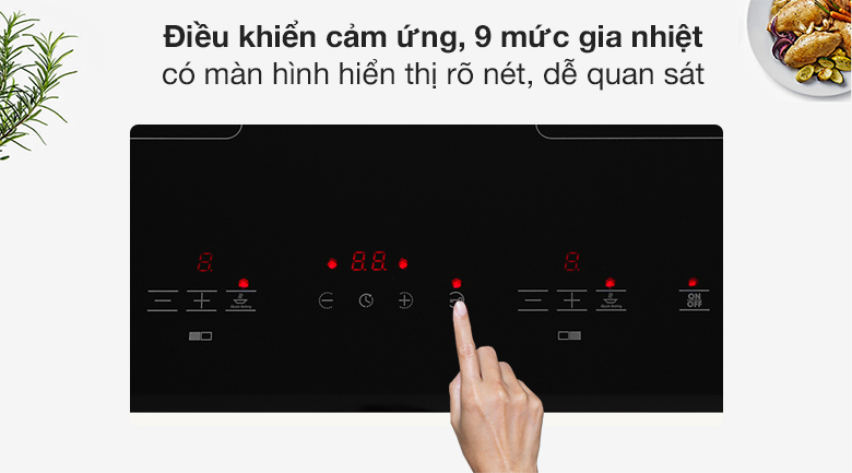 Thiết kế bảng điều khiển cảm ứng độc lập cho các vùng bếp, với 9 mức công suất, tùy chỉnh các chức năng chính xác