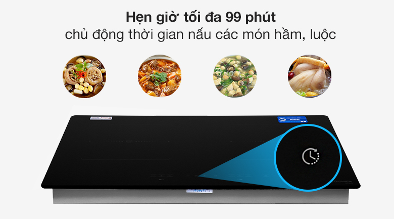 Bếp từ thiết lập hẹn giờ độc lập cho từng vùng náu đến 99 phút, giúp nấu ăn tiện lợi, món ăn chín ngon, không cháy khét