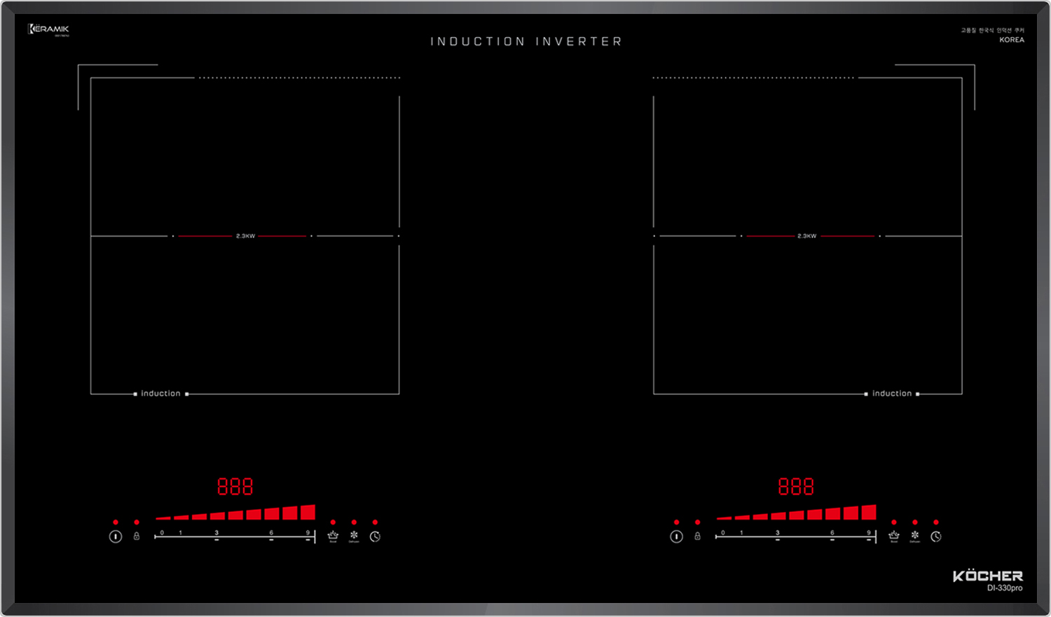 Đây một trong số rất ít bếp từ có thể đạt Booster lên đến 2300W. Với thiết kế của bếp từ Kocher DI-330Pro cả 2 vùng nấu có khả năng kích công suất Booster cực đại lần lượt là 2300W | 2300W giúp công việc đun nấu trở nên nhanh chóng và tiết kiệm thời gian khi cần thiết.