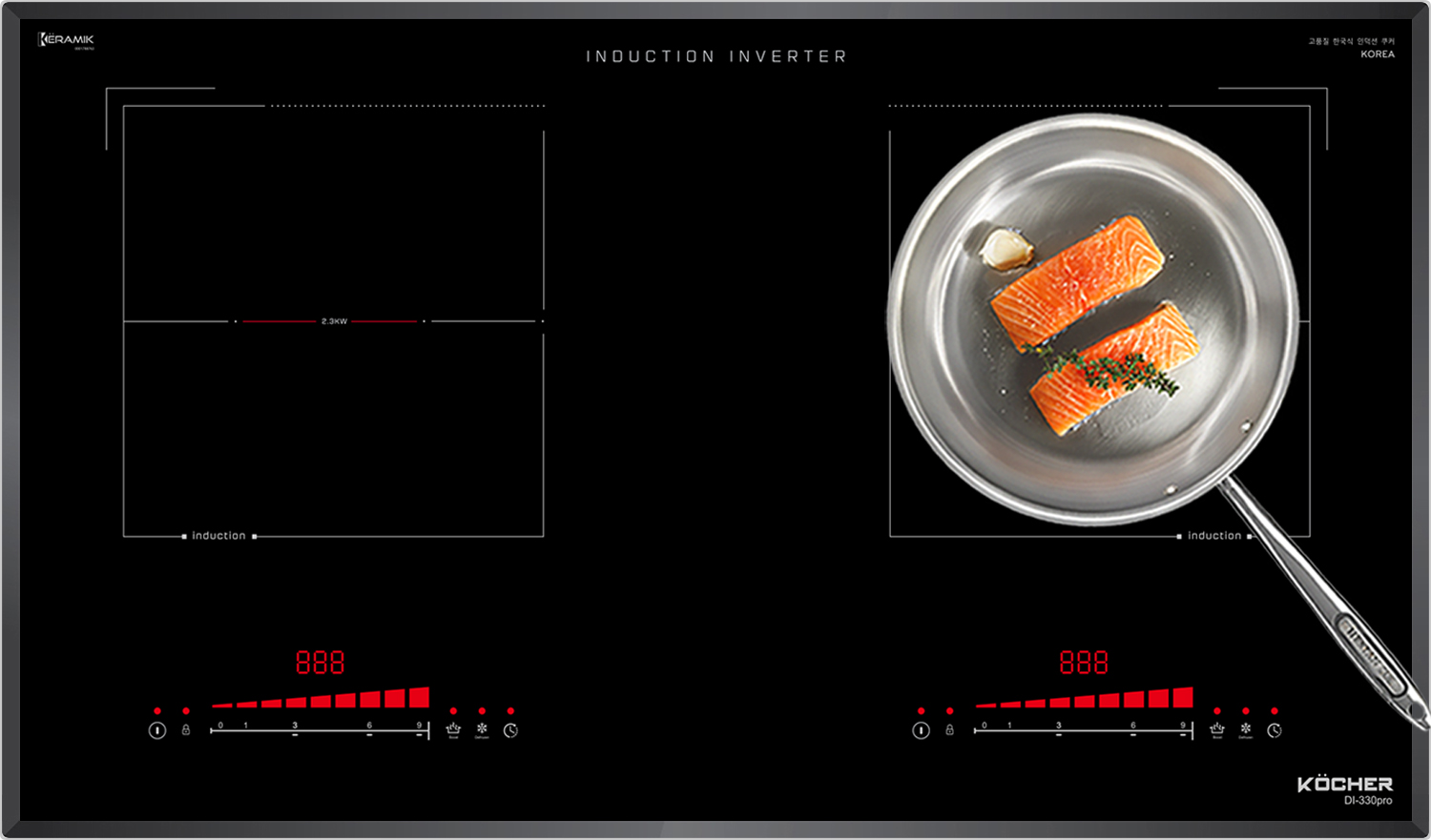 Với bếp từ Kocher DI-330Pro được tích hợp chức năng tự nhận diện vùng nấu, khi ta đặt nồi lên 1 trong 2 vùng nấu sau đó ấn nút khởi động bếp sau thời gian 1-2 giây bếp sẽ tự động tìm tìm vùng nấu đã có nồi, ta chỉ việc điều chỉnh mức công suất to nhỏ theo ý muốn mà không phải thao tác chọn vùng nấu như bếp thông thường.