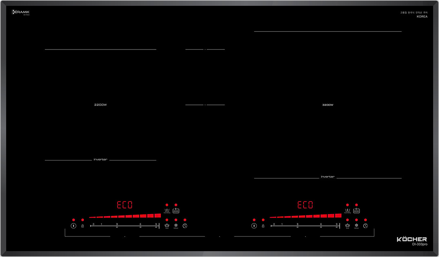 Đây một trong số rất ít bếp từ có thể đạt Booster lên đến 3200W. Với thiết kế của bếp từ Kocher DI-333Pro cả 2 vùng nấu có khả năng kích công suất Booster cực đại lần lượt là 2200W | 3200W giúp công việc đun nấu trở nên nhanh chóng và tiết kiệm thời gian khi cần thiết.