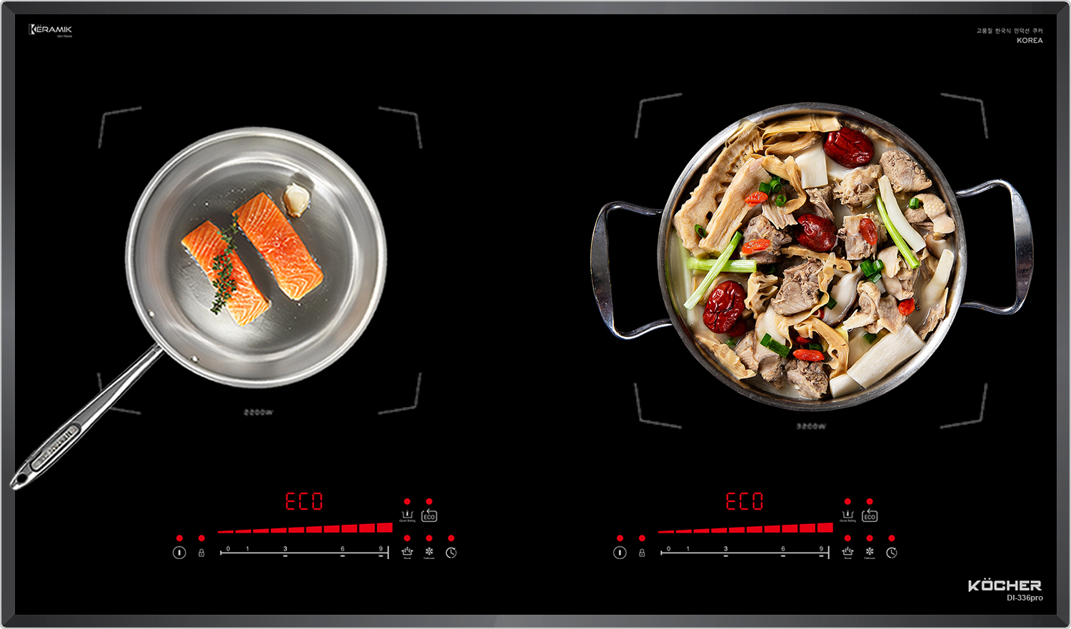 Với bếp từ Kocher DI-336Pro được tích hợp chức năng tự nhận diện vùng nấu, khi ta đặt nồi lên 1 trong 2 vùng nấu sau đó ấn nút khởi động bếp sau thời gian 1-2 giây bếp sẽ tự động tìm tìm vùng nấu đã có nồi, ta chỉ việc điều chỉnh mức công suất to nhỏ theo ý muốn mà không phải thao tác chọn vùng nấu như bếp thông thường.