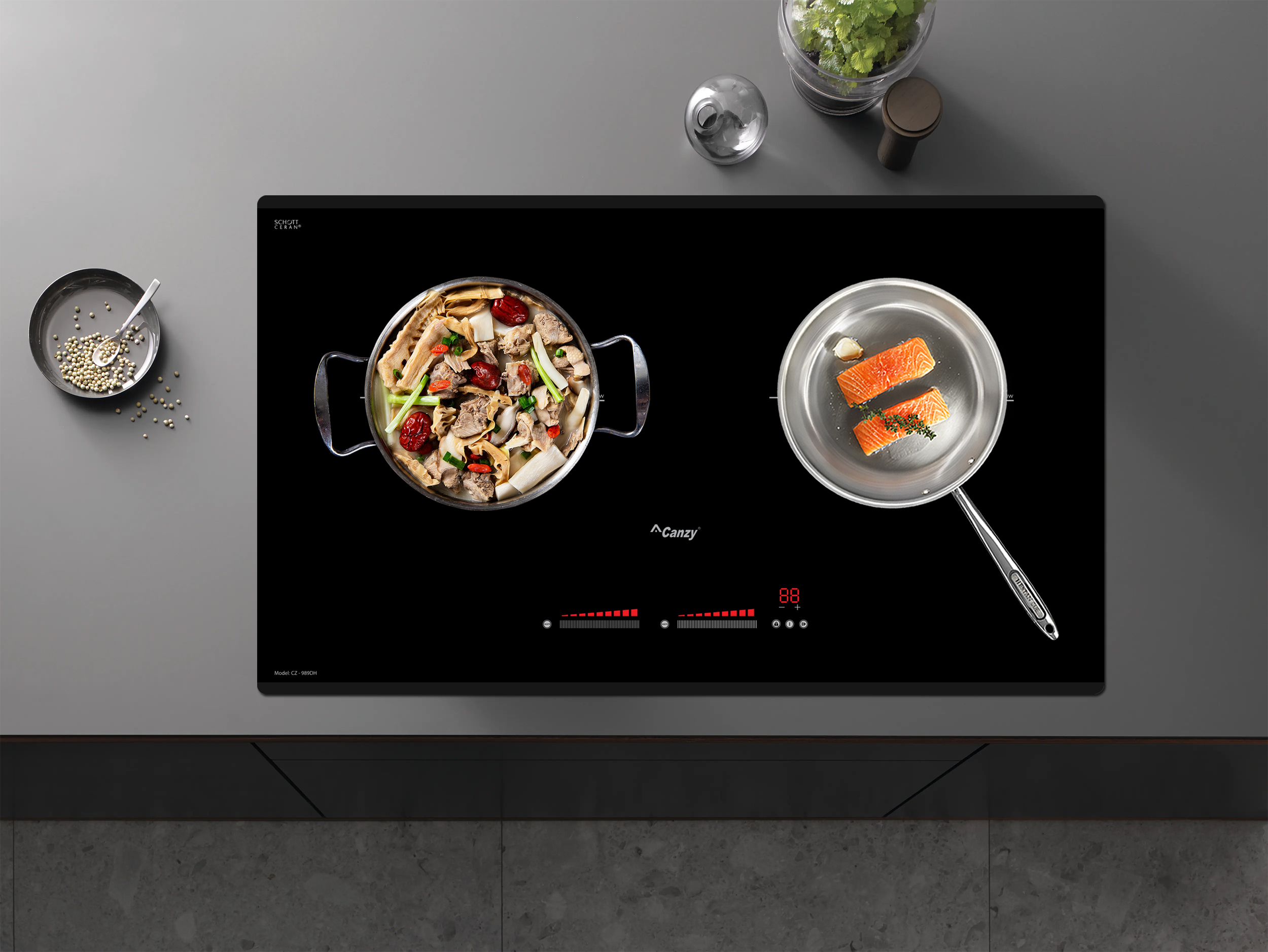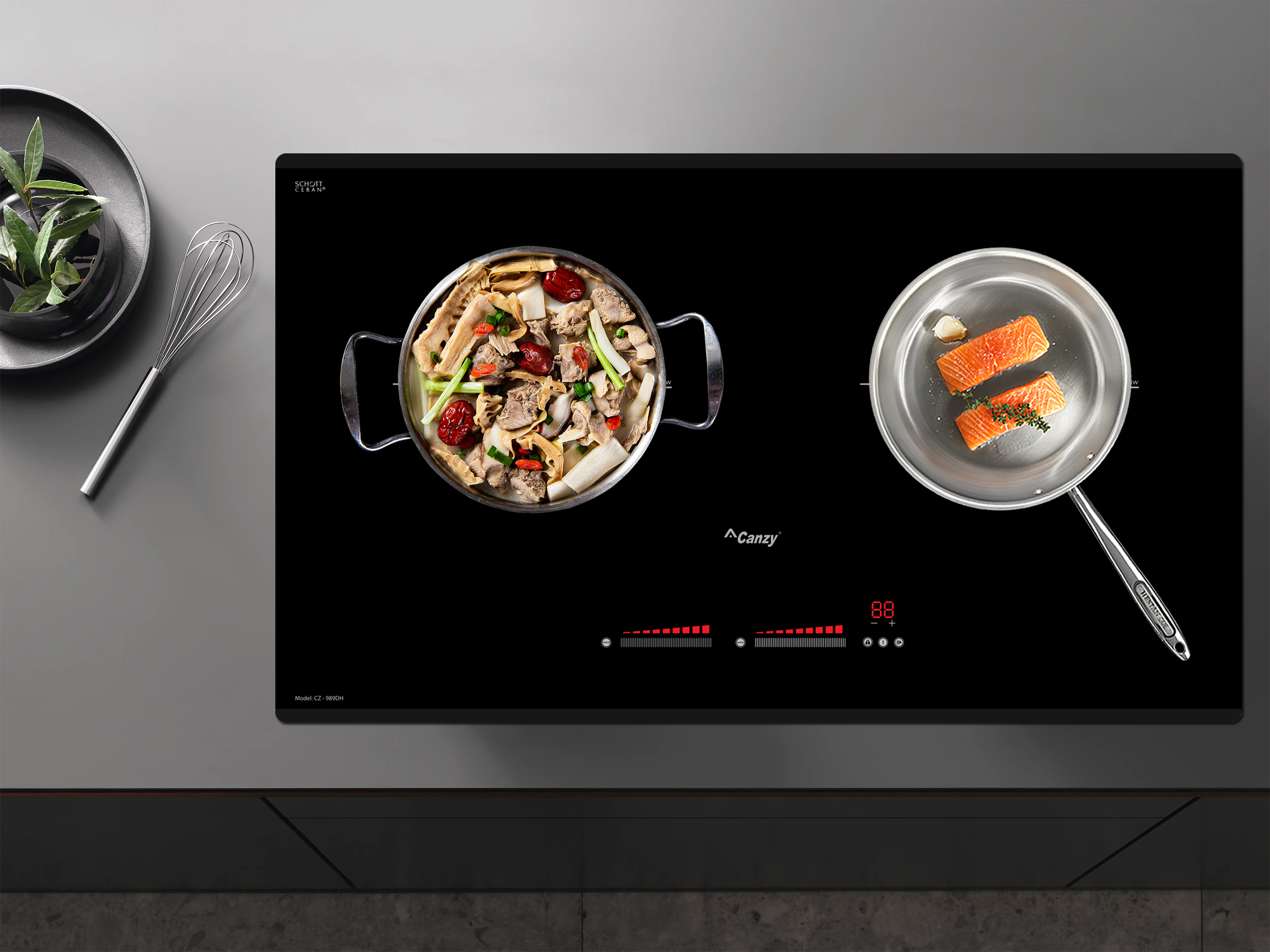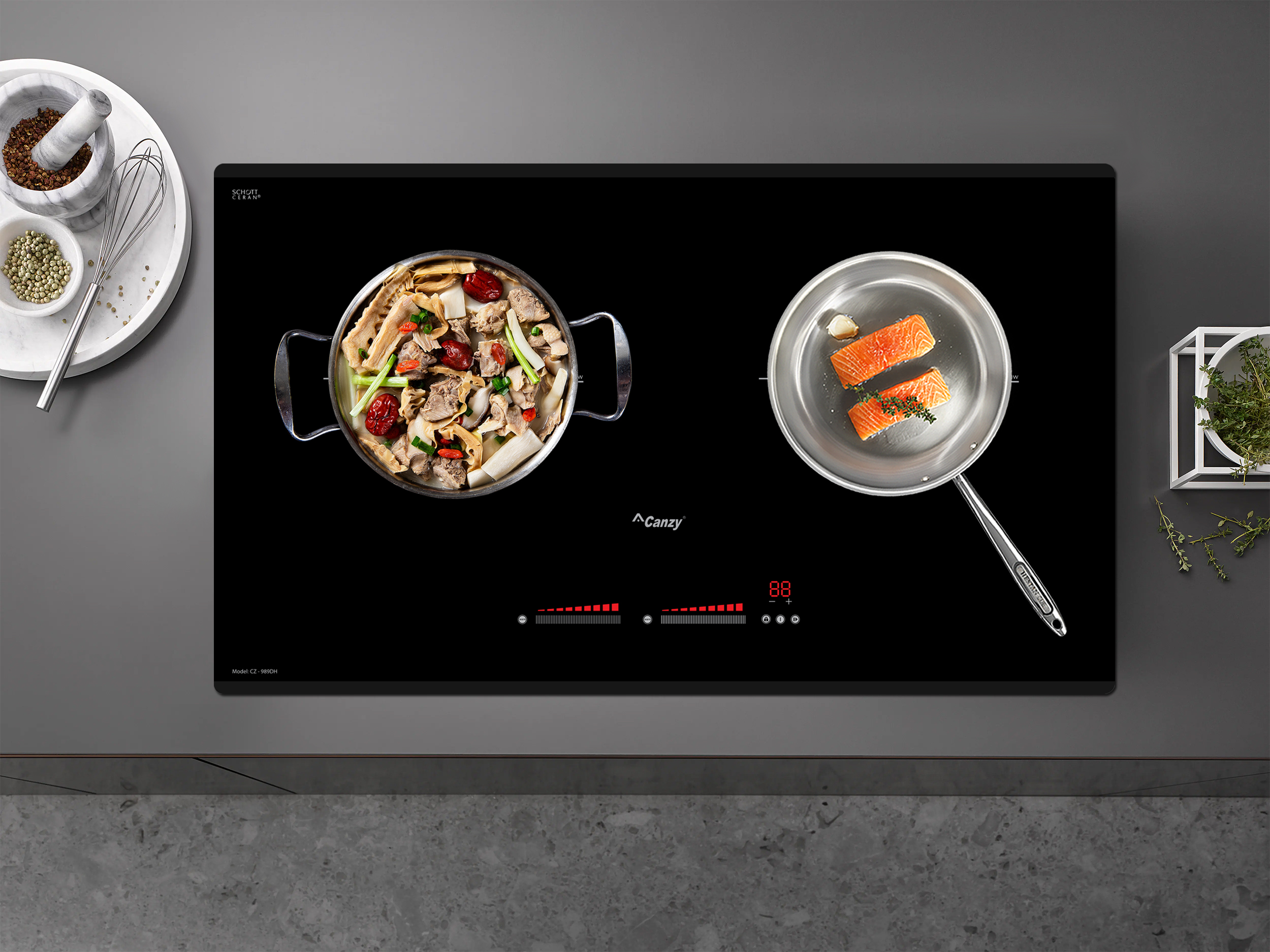 Vùng nấu của bếp từ Canzy CZ-989DH trang bị mâm từ E.G.O cao cấp nhập khẩu từ CHLB Đức, tự động nhận diện kích thước vật dụng nấu, giúp tiết kiệm 30% điện năng tiêu thụ của bếp so với những chiếc bếp từ không sử dụng loại mâm từ này. Kích thước của mỗi vùng nấu là bằng nhau, và đều thể hiện dòng chữ Induction giúp người dùng dễ dàng nhận biết đây là bếp từ.