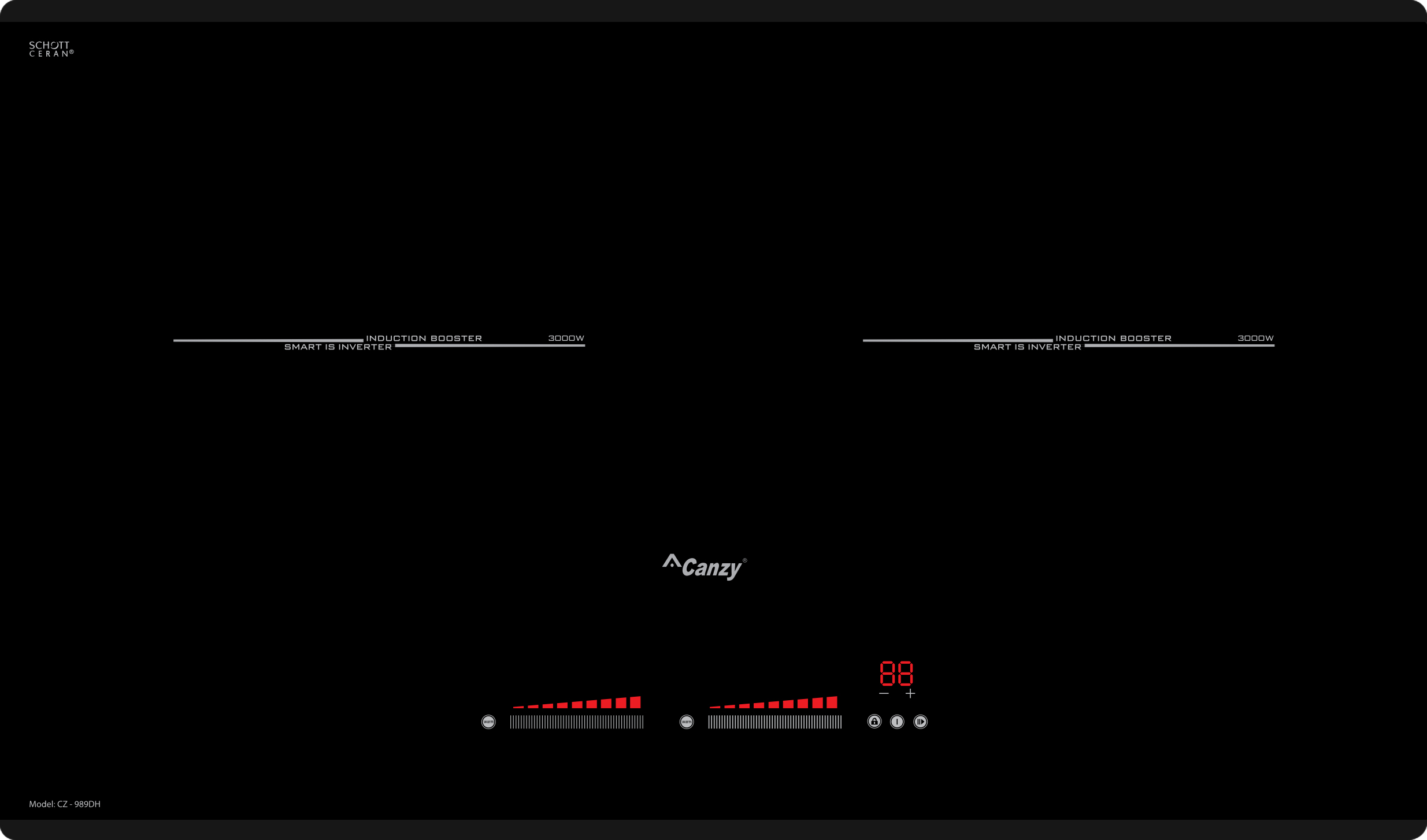 Bếp cảm ứng từ Canzy CZ-989DH có hai vùng nấu với đường kính là 23cm cùng mức công suất tối đa có thể đạt tới là 3000W. Bếp có khả năng tự động chia sẻ công suất giữa hai bếp nấu nên tổng công suất của bếp là 3700W.