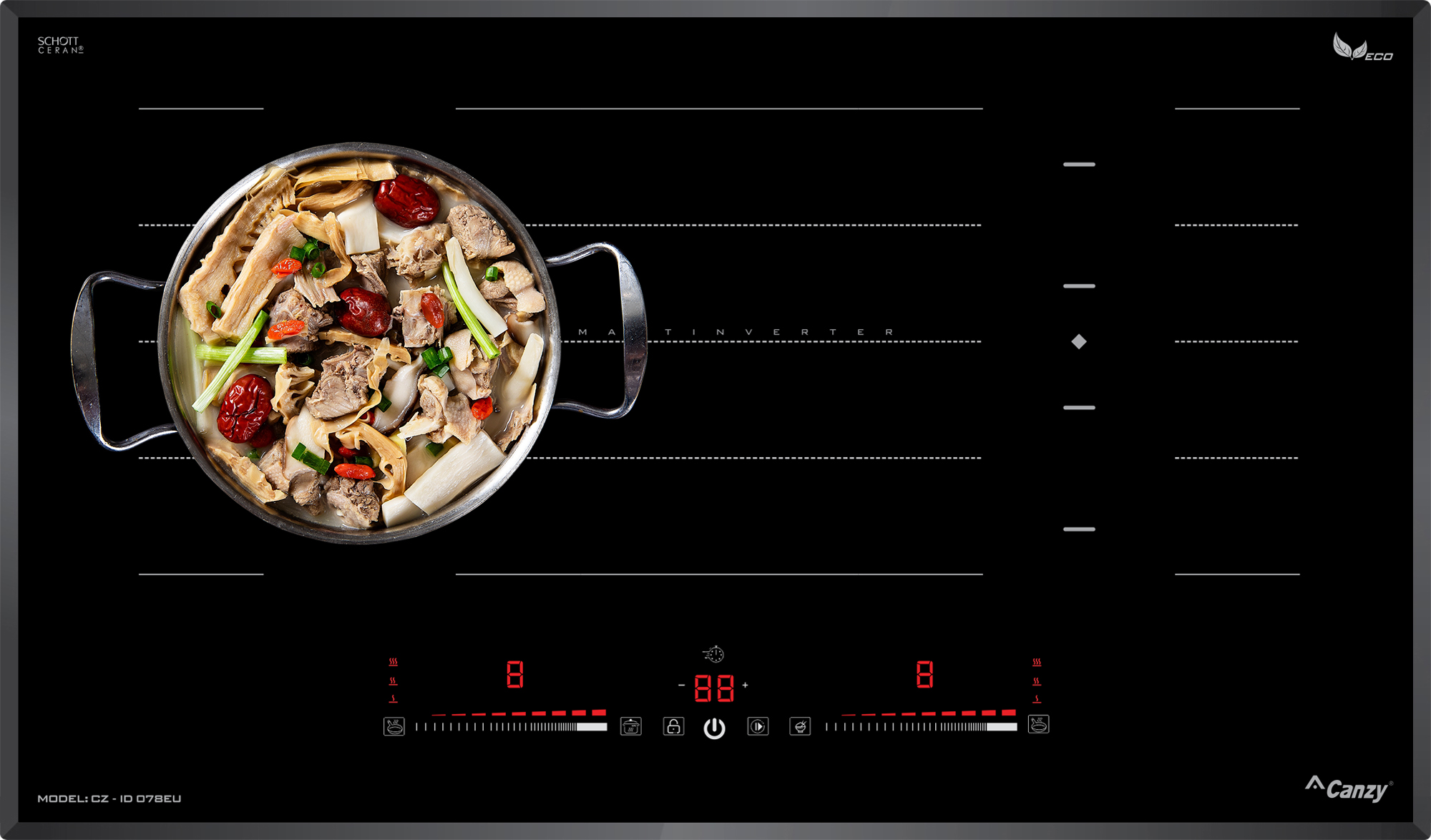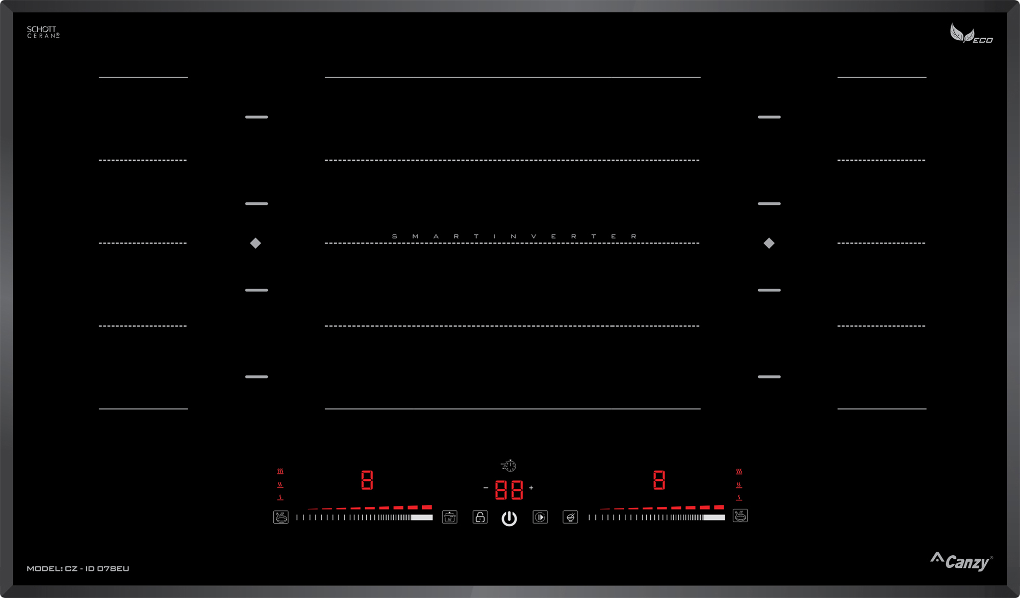 Bếp từ Canzy CZ-ID078EU được tích hợp chức năng tự nhận diện vùng nấu, khi ta đặt nồi lên 1 trong 2 vùng nấu sau đó ấn nút khởi động bếp sau thời gian 1-2 giây bếp sẽ tự động tìm vùng nấu đã có nồi, ta chỉ việc điều chỉnh mức công suất to nhỏ theo ý muốn mà không phải thao tác chọn vùng nấu như bếp thông thường. Công nghệ Inverter được áp dụng trên bếp từ Canzy CZ-ID078EU có khả năng phản ứng thay đổi công suất theo điều khiển ngay tức thì, khi người dùng điều chỉnh tăng giảm nhiệt độ đun nấu, bếp điều chỉnh thay đổi tức thì về mức nhiệt độ mong muốn.