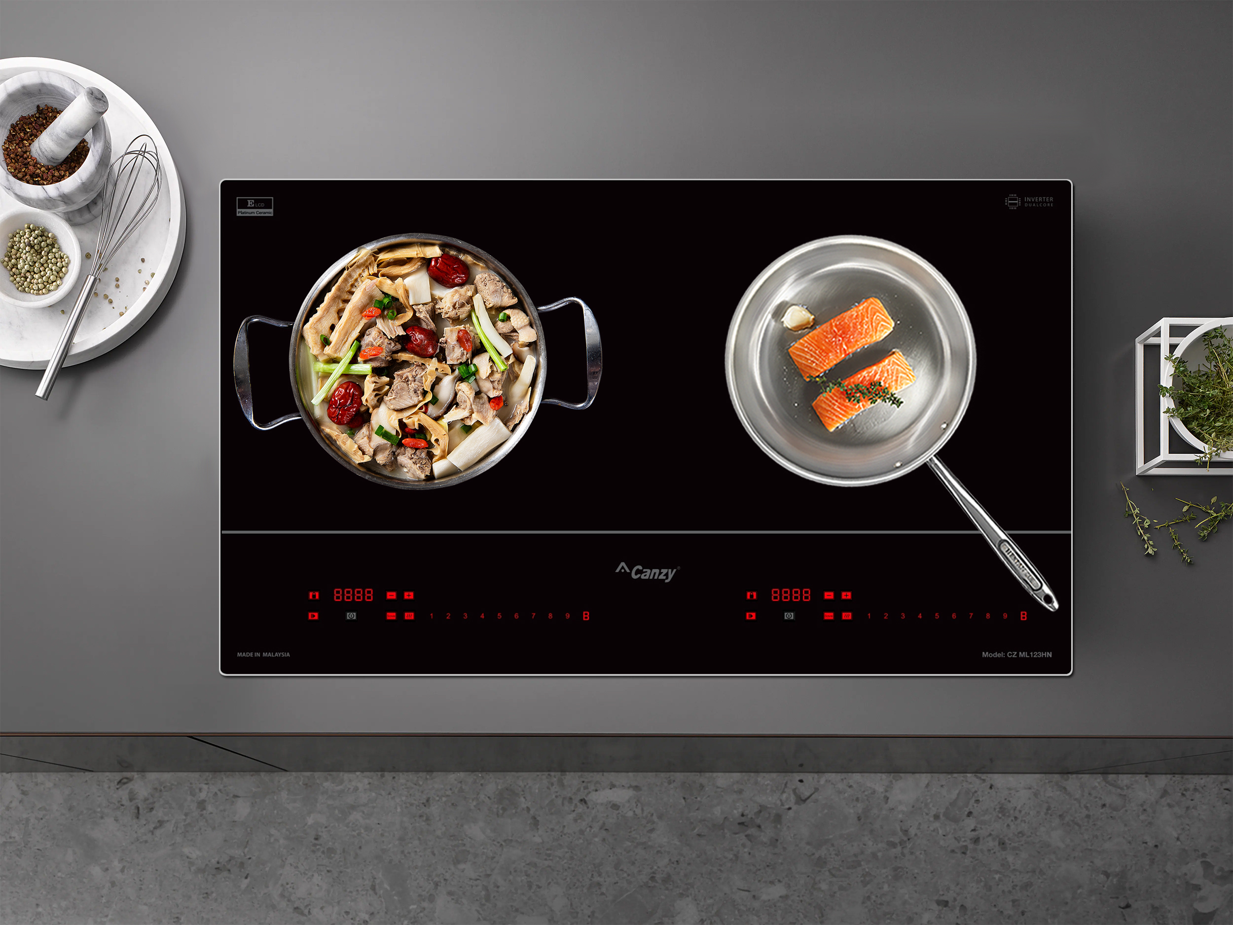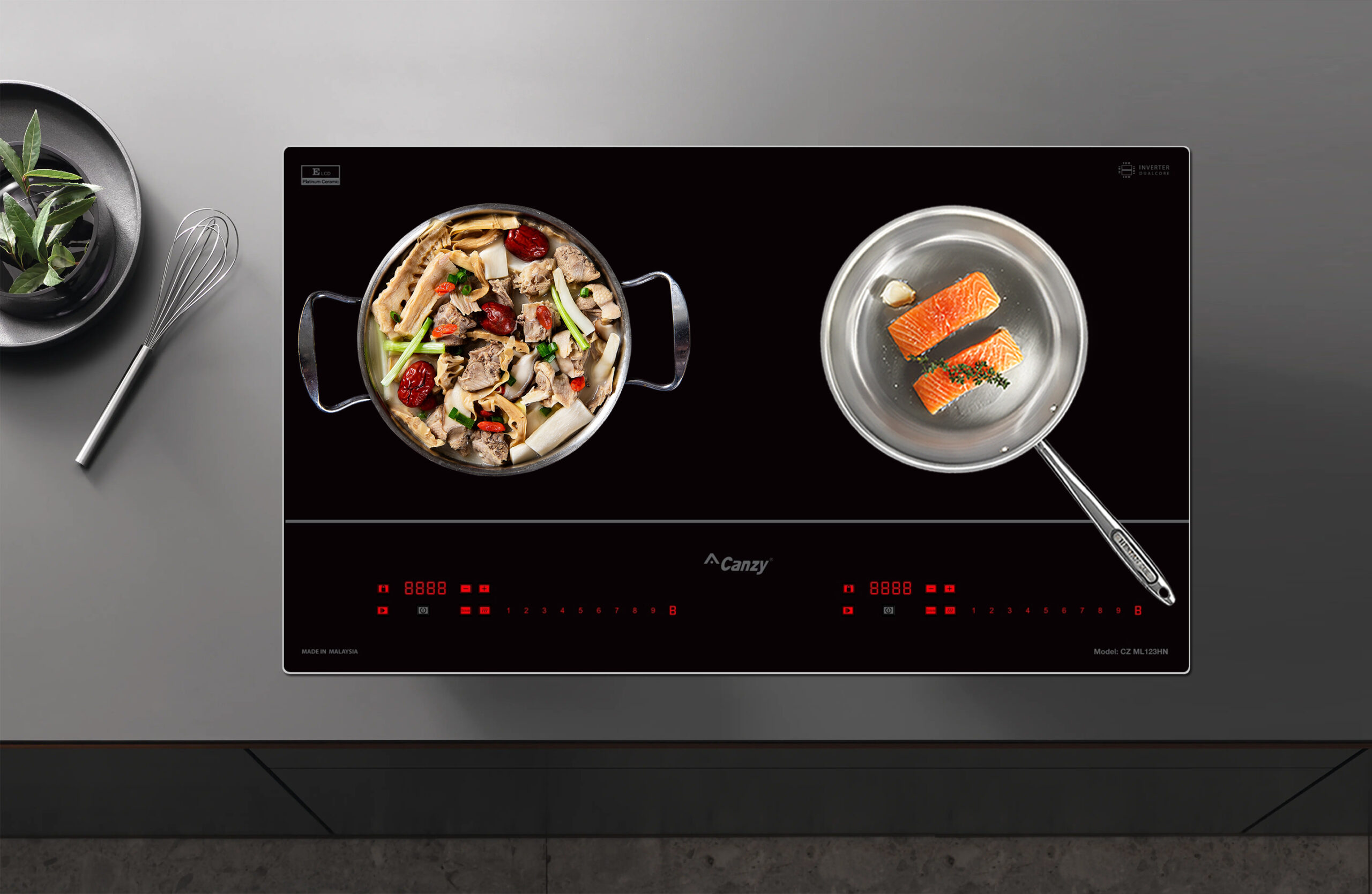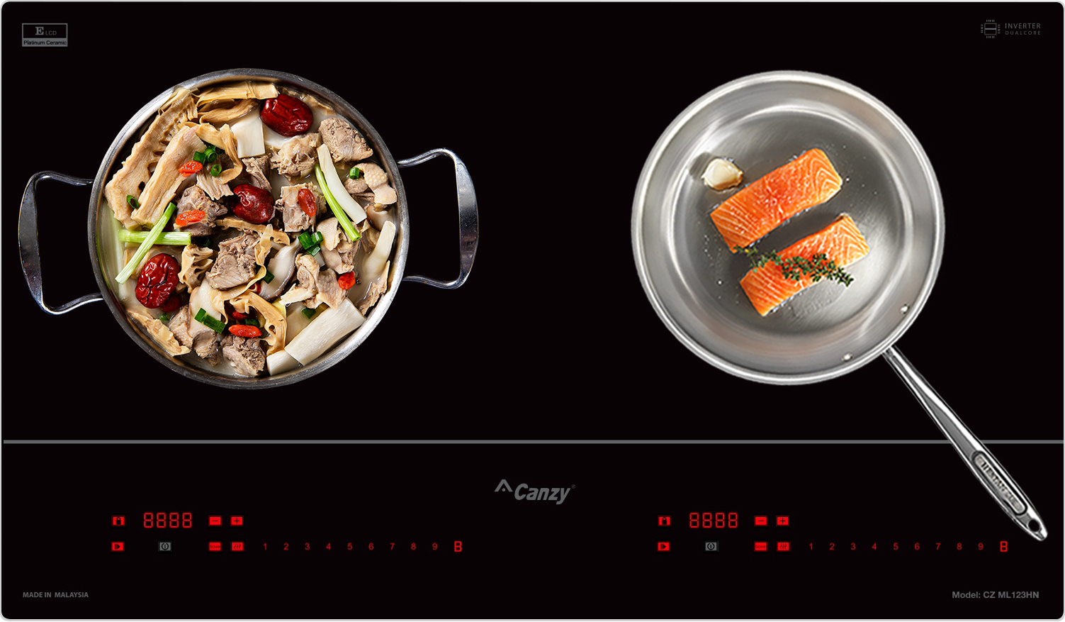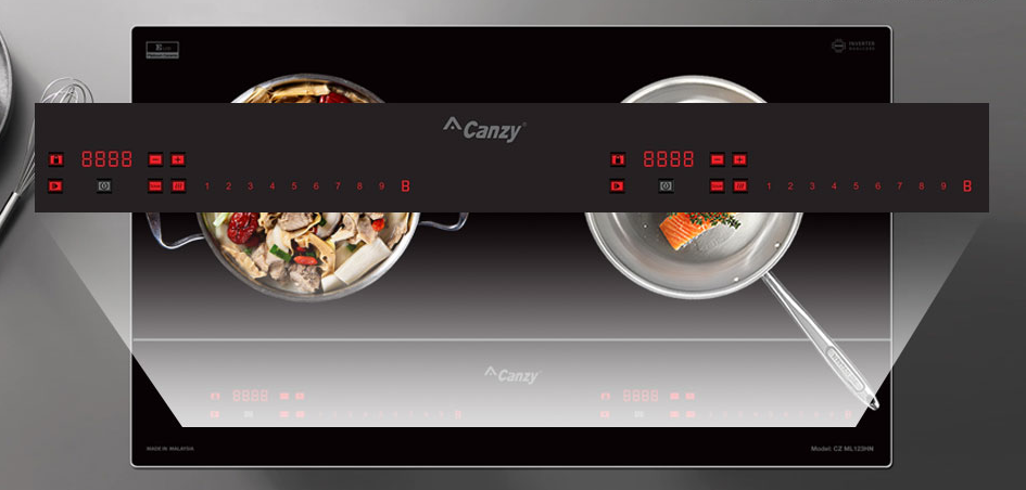 Bếp từ Canzy CZ-ML123HN được tích hợp chức năng tự nhận diện vùng nấu, khi ta đặt nồi lên 1 trong 2 vùng nấu sau đó ấn nút khởi động bếp sau thời gian 1-2 giây bếp sẽ tự động tìm vùng nấu đã có nồi, ta chỉ việc điều chỉnh mức công suất to nhỏ theo ý muốn mà không phải thao tác chọn vùng nấu như bếp thông thường. Công nghệ Inverter được áp dụng trên bếp từ Canzy CZ-ML123HN có khả năng phản ứng thay đổi công suất theo điều khiển ngay tức thì, khi người dùng điều chỉnh tăng giảm nhiệt độ đun nấu, bếp điều chỉnh thay đổi tức thì về mức nhiệt độ mong muốn.