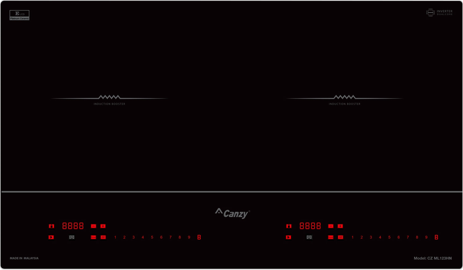 Bếp từ Canzy CZ-ML123HN gồm 2 vùng nấu với tổng công suất 6000W. Vùng nấu trái có công suất 2500W khi kích hoạt tính năng nấu siêu nhanh Booster công suất lên tới 3000W. Vùng nấu phải có công suất 2500W khi kích hoạt tính năng nấu siêu nhanh Booster công suất lên tới 3000W. Chỉ trong chốc lát sau khi kích hoạt tính năng này, nhiệt lượng trên vùng nấu từ tăng lên công suất tương đương với mức nhiệt lượng lớn nhất. Do đó, các món ăn được nấu chín nhanh hơn, tiết kiệm thời gian vào bếp cho chị em nội trợ. Chức năng Booster nấu siêu nhanh, tuy nhiên thời gian tối đa mặc định dùng chức năng này là 10 phút / lần tránh quá tải.