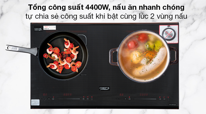 Tự chia sẻ công suất khi bật cùng lúc 2 vùng nấu với tổng công suất 4400W