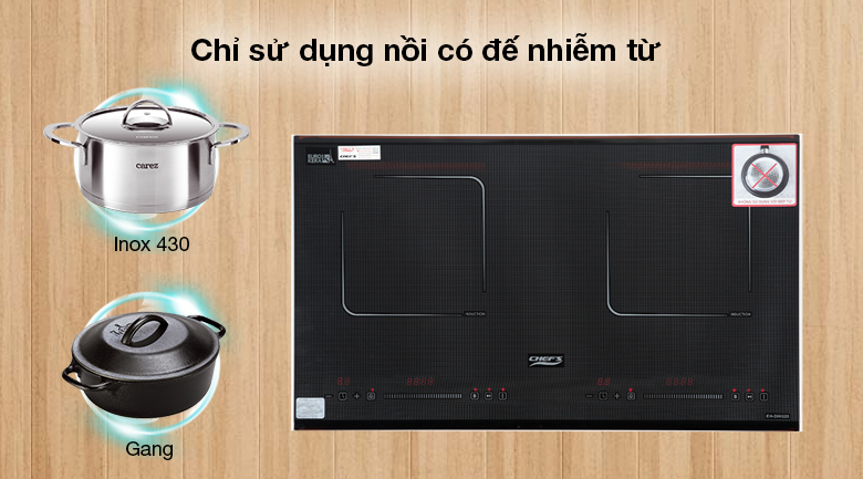 – Bếp sử dụng nồi/chảo có đáy từ (inox 430/gang) dạng đáy liền. Không sử dụng nồi, chảo có đáy rỗ tổ ong để tránh thất thoát nhiệt và hư hỏng sản phẩm.