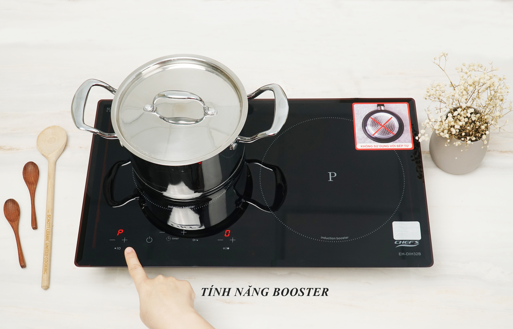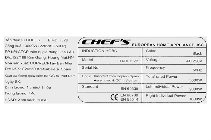 – Bếp từ Chef’s nấu ăn nhanh, tiết kiệm thời gian với tổng công suất 3400W.