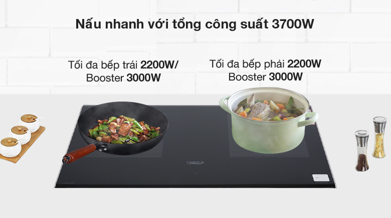 2 vùng nấu đường kính 22 cm, hỗ trợ công suất tối đa 2200W/vùng nấu, booster lên đến 3000W. Tính năng chia sẻ công suất tự động để bếp hoạt động hiệu quả, bền bỉ hơn.