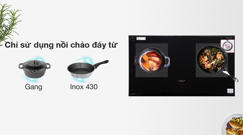Bếp từ kén nồi, cần dùng với nồi nấu có chất liệu đáy nồi phù hợp như gang, inox 430 để có hiệu quả gia nhiệt tốt nhất