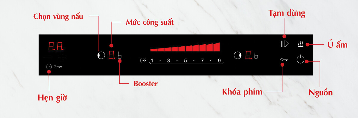 Bảng điều khiển được thiết kế tinh gọn mà sang trọng. Bếp thiết kế 1 bảng điều khiển dùng chung cho 2 vùng nấu, tiết kiệm không gian mặt bếp. Phím điều khiển dạng trượt slide, điều chỉnh 9 mức công suất + booster rất nhạy kể cả khi tay ướt.