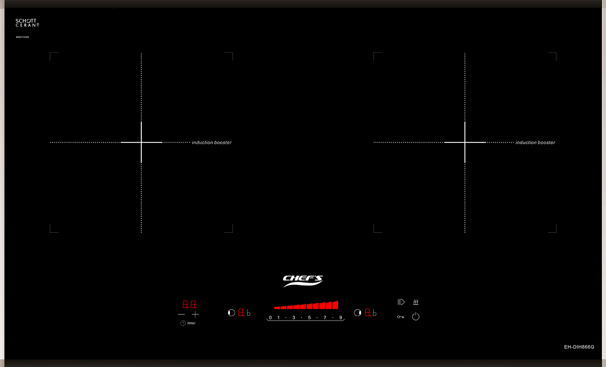 Bếp từ Chef’s EH-DIH866G sử dụng mặt kính Schott Ceran nổi tiếng với độ bền đẹp. Kính Schott có khả năng chịu lực, chịu nhiệt cao (chịu nhiệt 1000°C, sốc nhiệt đến 800°C). Bề mặt kính phẳng, mịn, dễ dàng vệ sinh, chùi rửa. Kính màu đen sáng làm tăng tính thẩm mỹ cho gian bếp.