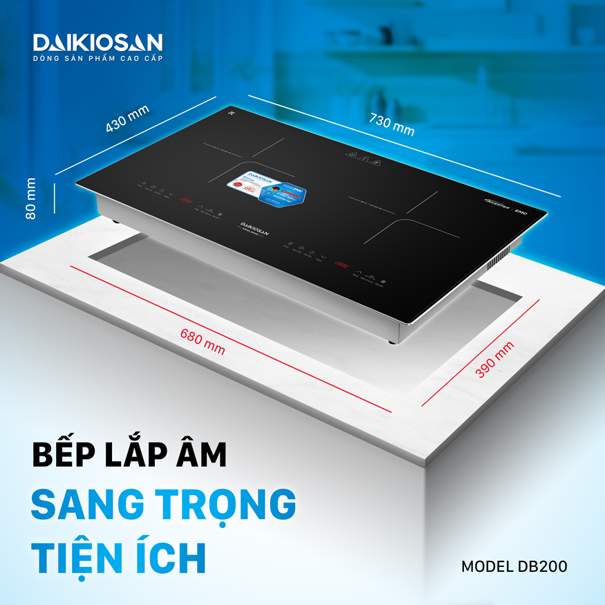 Bếp từ đôi Daikiosan DB200 được thiết kế nhỏ gọn, kích thước tương thích với thiết kế cấu trúc bếp của mỗi gia đình muốn sử dụng bếp đôi.