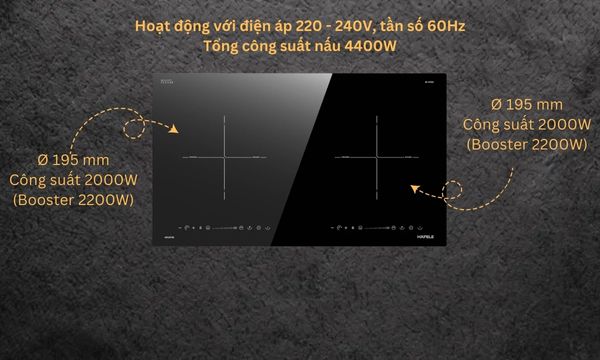Bếp từ Hafele 536.61.736 có tổng công suất nấu là 4400W với điện áp nguồn tối thiểu – tối đa tương ứng là 220 – 240V. Mỗi vùng nấu trên chiếc bếp từ này có thể gia nhiệt lên đến 2000W (Booster 2200W) giúp nấu nướng nhanh chóng mà vẫn đảm bảo an toàn.