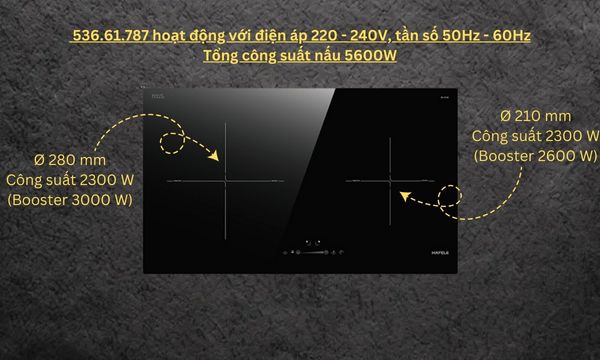 Công suất bếp từ Hafele HC-I752B là 5600W, vận hành ổn định ở mức điện áp 220 – 240V. Từng vùng nấu có công suất gia nhiệt tương ứng là 2300W (Booster đạt 2600 – 3000W), đáp ứng tốt nhu cầu nấu nướng nhanh như luộc rau hay tráng mì.