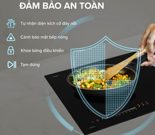 - Bếp cũng được trang bị chức năng tự động tắt bếp khi xoong nồi rời vùng nấu, tính năng tự ngắt an toàn khi tràn nước để đảm bảo an toàn tối ưu hơn cho người sử dụng.