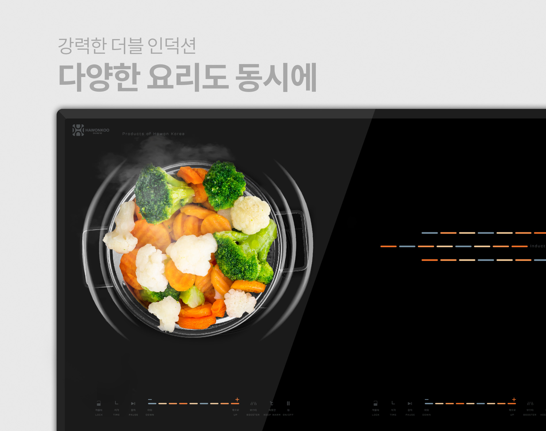 Là điểm nhấn giao thoa hoàn hảo giữa thời trang và căn bếp, bếp từ đôi Hawonkoo CEH-208-II sở hữu kiểu dáng sang trọng với mặt kính đen huyền bí điểm xuyết các dải màu đa sắc độc đáo từ Hàn Quốc. Các chi tiết trên bề mặt bếp đều được thiết kế tối giản đạt đến độ tinh tế và hài hòa về cả màu sắc lẫn đường nét, góp phần tô điểm không gian bếp của mọi gia đình.
