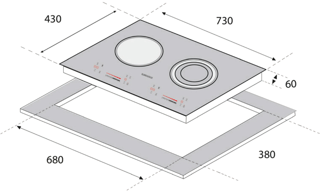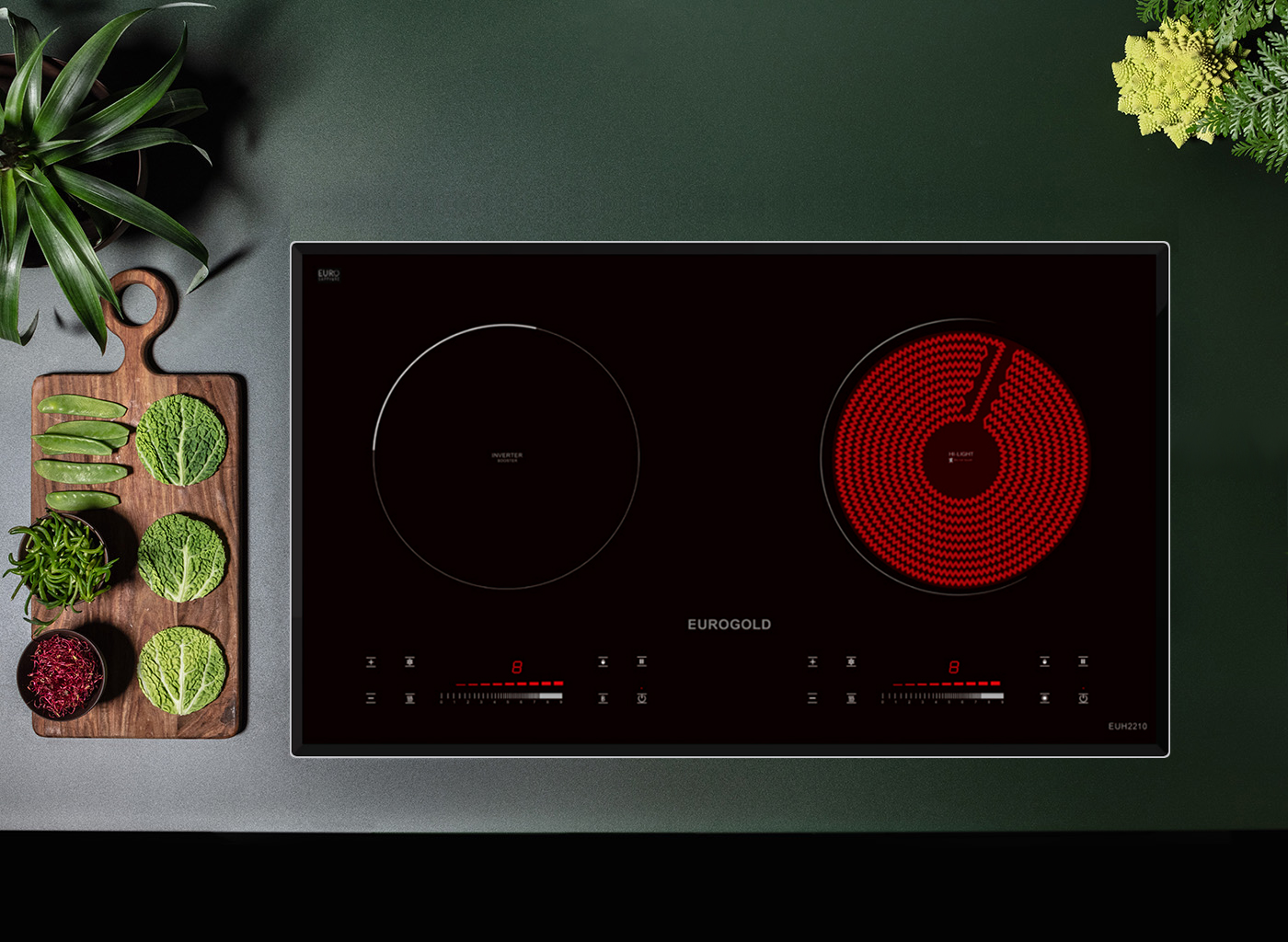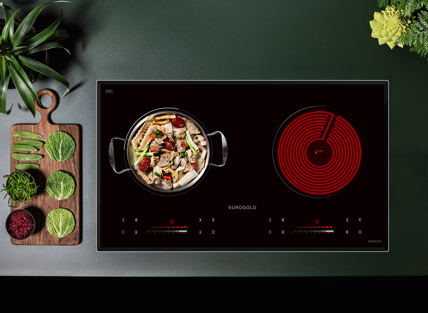 Bếp điện từ Eurogold EUH2210 gồm 2 vùng nấu với tổng công suất 3700W. Vùng nấu từ trái có công suất 2300W khi kích hoạt tính năng nấu nhanh Booster công suất lên tới 3000W. Vùng nấu hồng ngoại sử dụng mâm nhiệt Hi-light với 02 vòng nhiệt có công suất 2300W.