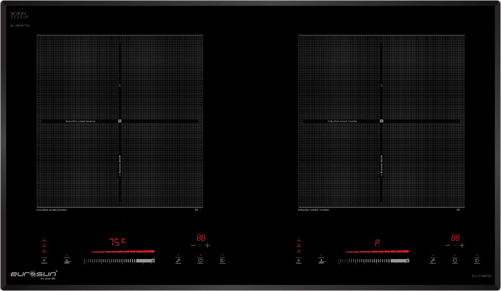 Bảo vệ quá nhiệt (cảm biến nhiệt độ tích hợp trong từng vùng nấu): Bếp Eurosun được thiết kế cảm biến nhiệt độ dưới mỗi vùng nấu, khi có hiện tượng quá nhiệt (nồi đun bị cạn, cháy…) bếp sẽ chủ động ngắt công suất để đảm bảo an toàn cho thiết bị cũng như đảm bảo không sự cố đáng tiếc xảy ra.