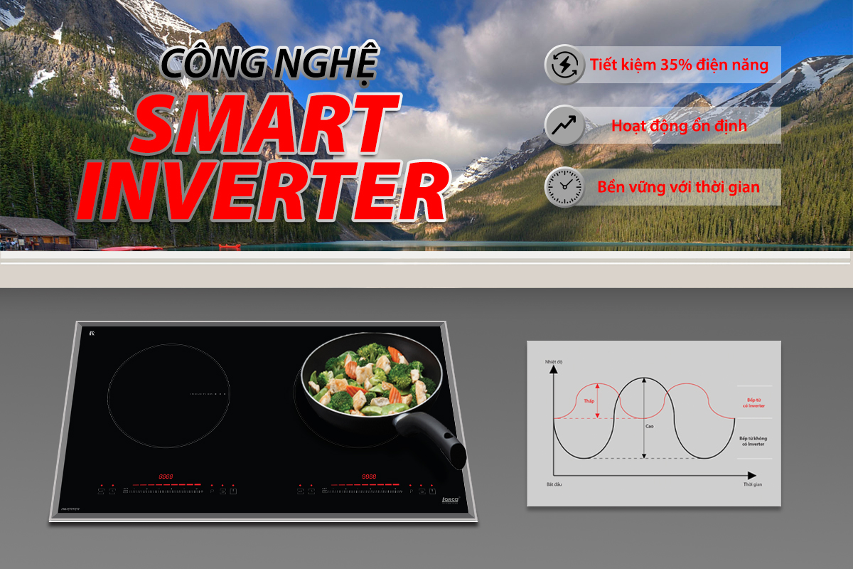 Bếp từ Lorca tích hợp công nghệ biến tần Inverter tiết kiệm lên tới trên 35% điện năng tiêu thụ, giúp bếp đun nấu duy trì ổn định công suất khi đun nấu, giữ cho bếp gia nhiệt duy trì ổn định, không bị đóng ngắt liên tục như các dòng bếp thông thường.