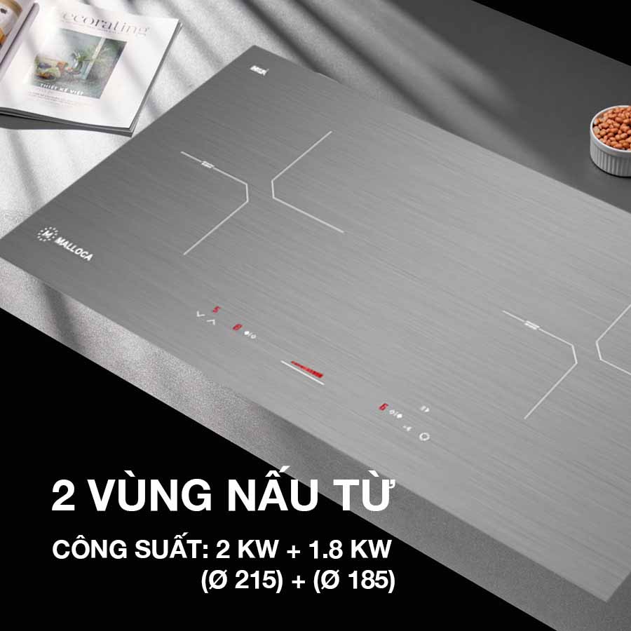 - Thiết kế 2 vùng nấu riêng biệt: Có tới 2 vùng nấu, bếp từ Malloca Mh-02IS giúp bạn tận dụng không gian bếp để nấu nhiều món cùng lúc. Khoảng cách 2 vùng nấu rộng rãi đảm bảo an toàn, tránh bị phỏng khi bạn nấu ăn trên bếp.