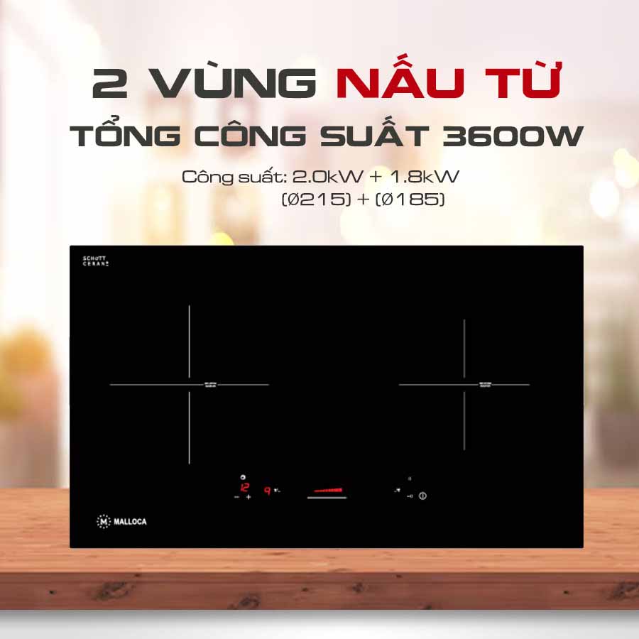Công suất của bếp từ là 3800W ( 2000 + 1800 W). Ngoài ra, bếp được tích hợp với chức năng booster có thể tăng gấp đôi nhiệt độ. Với chức năng này, người dùng có thể dễ dàng điều chỉnh tăng nhiệt độ nhanh hơn mà vẫn có thể tiết kiệm được điện năng khoảng 50%.