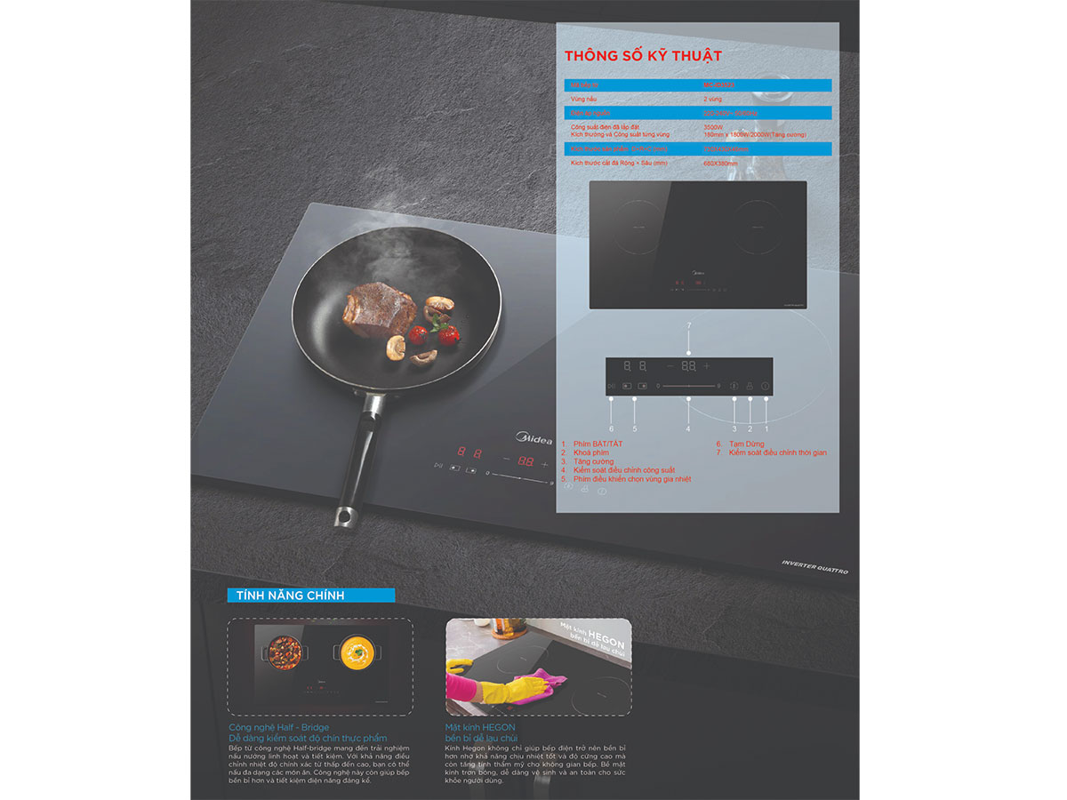 MC-ID3523 là một trong số ít bếp từ âm Midea được tích hợp công nghệ Half-Bridge (công nghệ mạch bán cầu) thông minh. Với công nghệ này, bếp từ sẽ sử dụng mạch Inverter có khả năng chuyển đổi điện áp và tần số theo nhu cầu đun nấu thực tế. Nhờ vậy, bếp từ sẽ giúp thực phẩm chín đều và tiết kiệm năng lượng hơn.