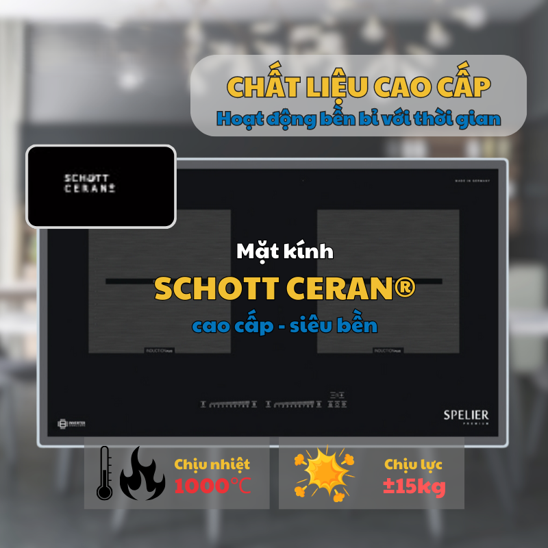 Spelier SPE IC 1088 EG sở hữu mặt kính SCHOTT CERAN® Made in Germany, một thương hiệu nổi tiếng về độ bền và tính thẩm mỹ. Mặt kính được in hai màu độc đáo, mài vát 4 cạnh và bo viền nhôm Aluminium cao cấp, tạo nên sự sang trọng và tinh tế cho không gian bếp. Thiết kế này không chỉ đẹp mắt mà còn dễ dàng vệ sinh, giúp bếp luôn sáng bóng như mới.