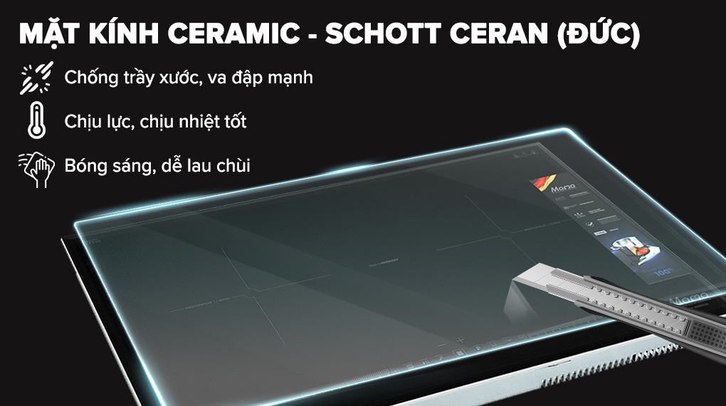 – Bếp từ đôi MMB9996 có mặt bếp bằng kính Ceramic – Schott Ceran (Đức) chịu lực, chịu nhiệt tốt, bóng sáng bền đẹp, dễ lau chùi.