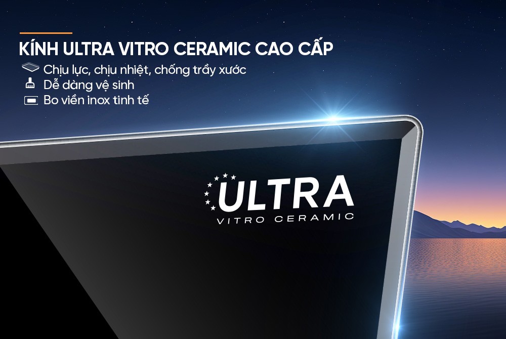 Mặt kính ULTRA VITRO CERAMIC được làm từ vật liệu cao cấp, có khả năng chịu lực và chịu nhiệt ấn tượng, bền bỉ theo thời gian. Bề mặt kính chống trầy xước, giúp bếp luôn sáng bóng và phù hợp với mọi không gian bếp hiện đại. Màu sắc tinh tế và bề mặt nhẵn mịn của mặt kính giúp việc lau chùi trở nên dễ dàng hơn bao giờ hết, chỉ cần thao tác nhẹ nhàng là bếp sẽ sạch sẽ như mới giúp tích kiệm tối đa thời gian.