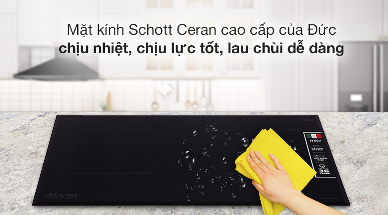 Mặt bếp kính Schott Ceran của Đức vát cạnh tinh tế, dày bền, chống nứt vỡ tốt, lau chùi nhẹ nhàng