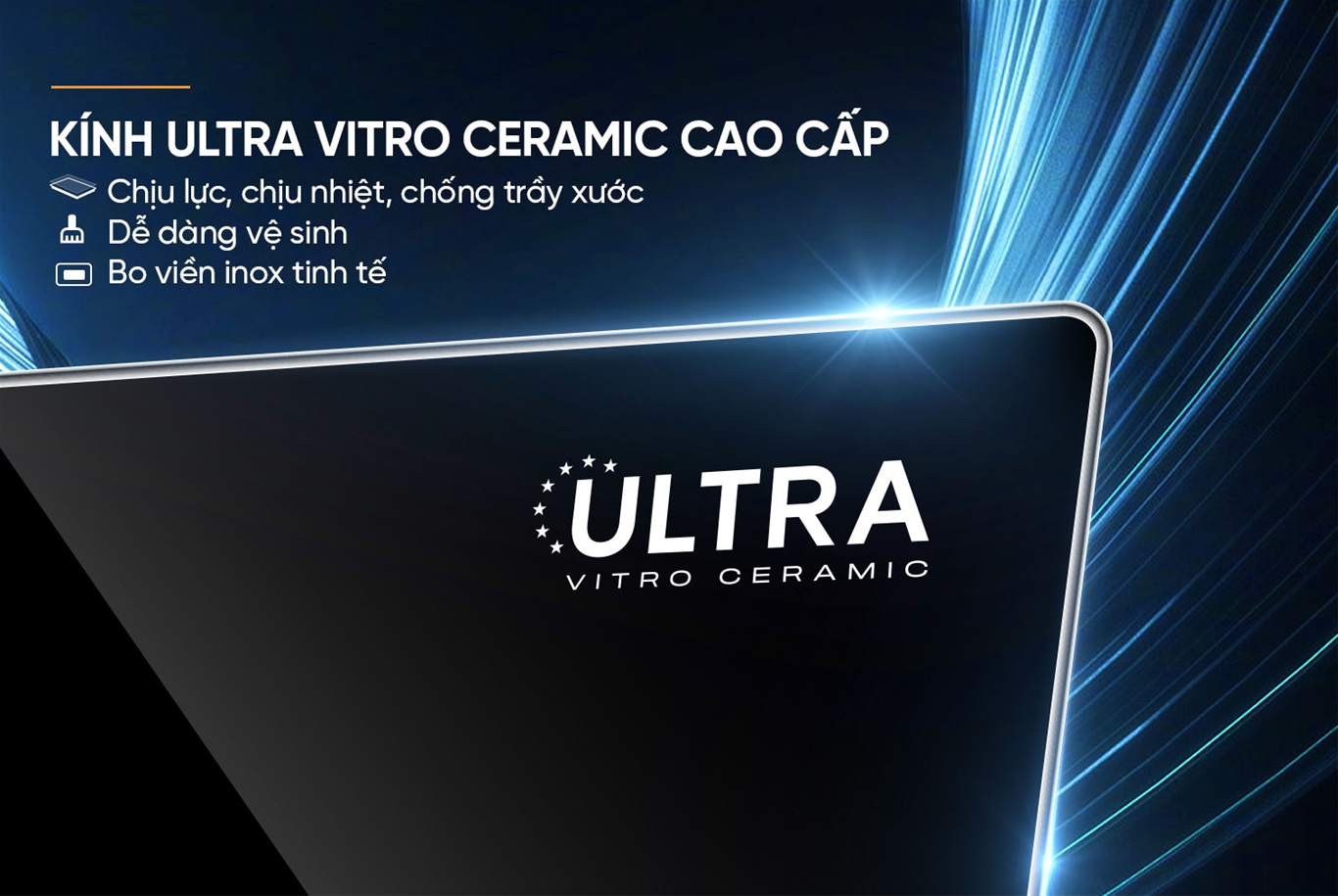 Sản phẩm sở hữu thiết kế hoàn hảo với mặt kính Ultra Vitro Ceramic cao cấp, sang trọng với độ bền vượt trội. Chất liệu kính này có khả năng chịu lực, chịu nhiệt tốt và chống trầy xước, giúp dễ dàng vệ sinh sau mỗi lần sử dụng. Nổi bật trên mặt kính nguyên khối màu đen toàn phần là những họa tiết tối giản, tinh tế, mang tính thẩm mỹ cao, Không chỉ thế, sản phẩm có sự sang trọng hơn nhờ thiết kế bo viền kim loại 4 cạnh chắc chắn, giúp nâng đỡ và bảo vệ mặt kính, tránh các nguy cơ gây nứt vỡ khi bị va đập vào mép sản phẩm.