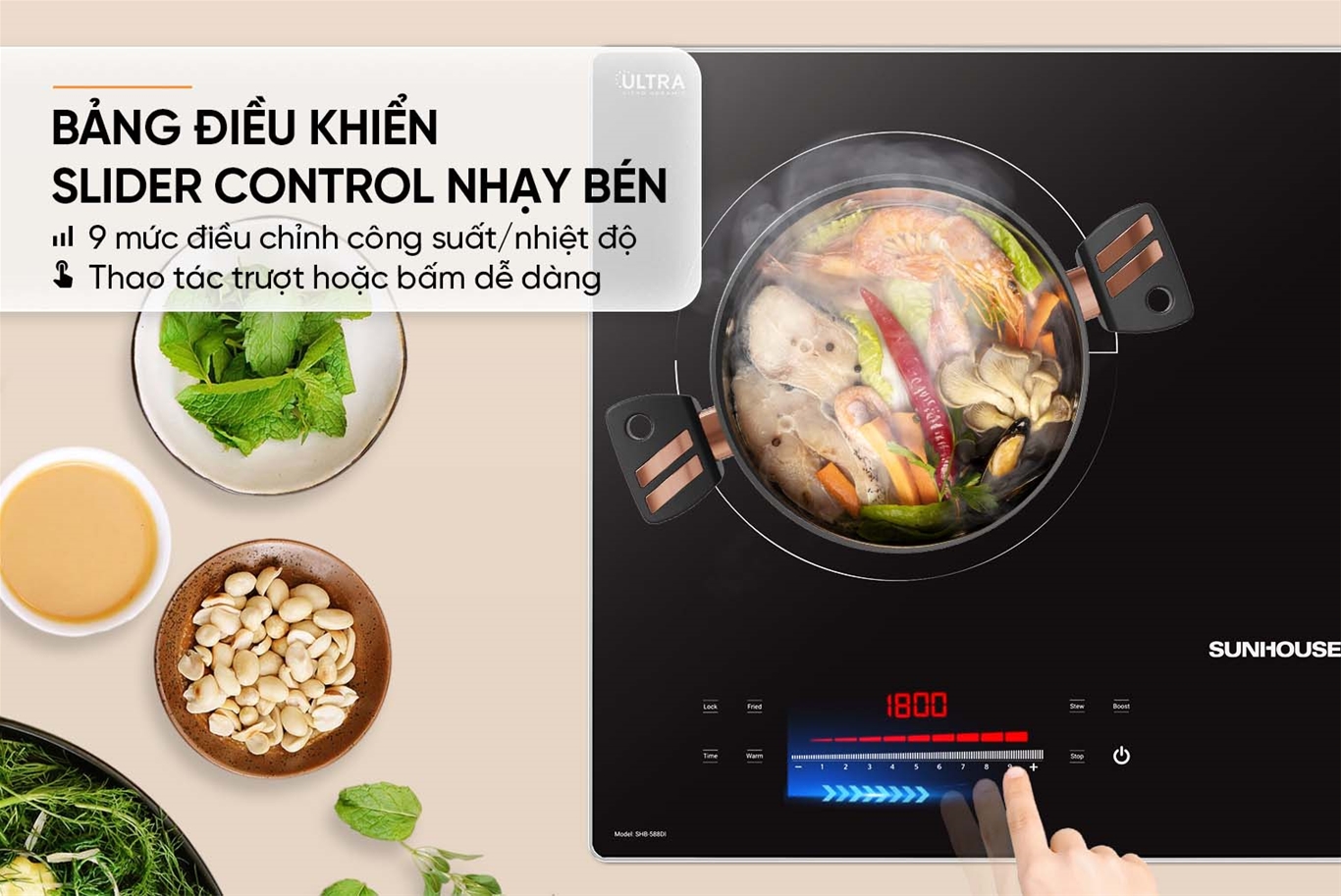 Bếp có 9 mức điều chỉnh nhiệt độ/công suất với 2 bảng điều khiển riêng biệt cho từng vùng nấu. Mặt điều khiển SLIDER CONTROL cảm ứng nhạy bén giúp điều chỉnh nhiệt độ và các chế độ nấu nhanh chóng và thuận tiện chỉ với 1 thao tác. Người dùng thực hiện thao tác trượt tay sang trái hoặc sang phải để tăng/giảm và điều chỉnh nhiệt độ, công suất hoặc thời gian. Điều khiển cảm ứng trượt dễ dàng sử dụng, phù hợp với mọi đối tượng.