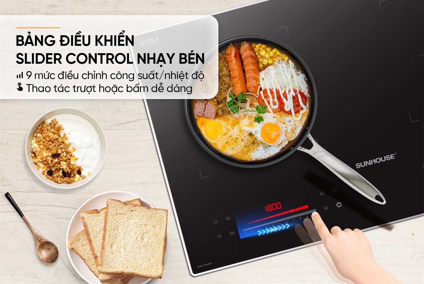Sản phẩm được trang bị mặt điều khiển nhạy bén tích hợp phím cảm ứng trượt và bấm riêng biệt cho từng vùng nấu với 9 mức nhiệt từ thấp tới cao. Chỉ với thao tác trượt tay sang trái hoặc phải, người dùng đã có thể tăng giảm và điều chỉnh công suất, nhiệt độ thời gian một cách dễ dàng.