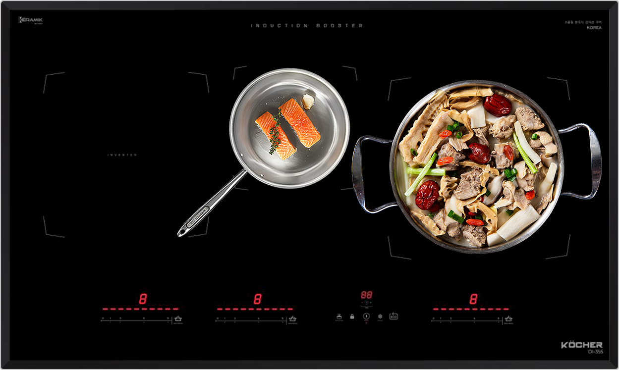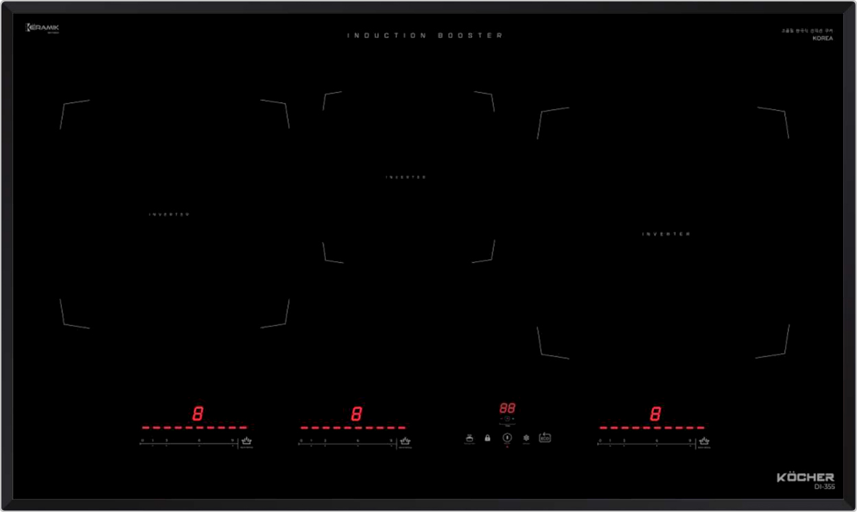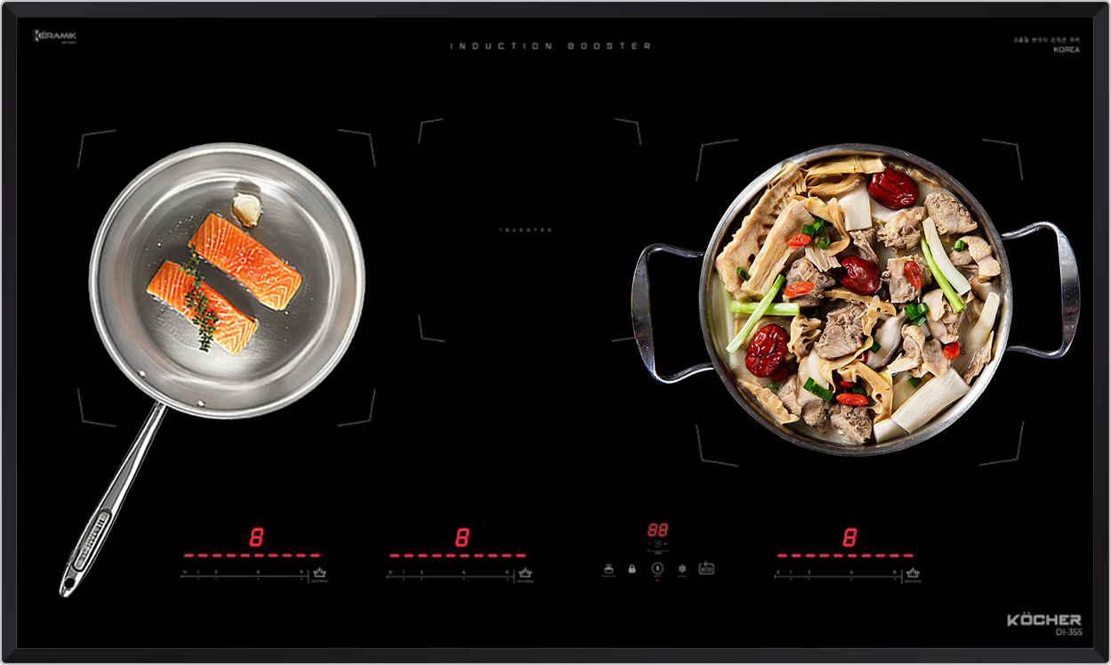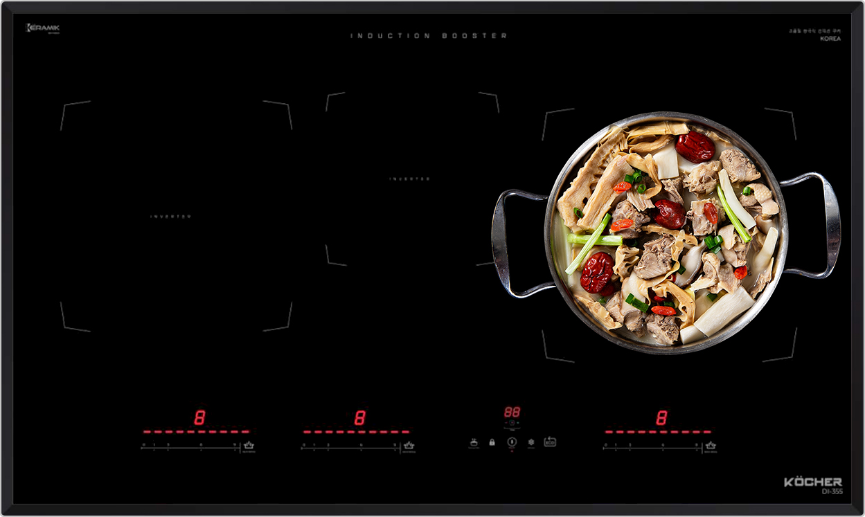 Đây một trong số rất ít bếp từ có thể đạt Booster lên đến 3000W. Với thiết kế của bếp từ Kocher DI-355 cả 3 vùng nấu có khả năng kích công suất Booster cực đại lần lượt là 2500W | 1600W | 3000W giúp công việc đun nấu trở nên nhanh chóng và tiết kiệm thời gian khi cần thiết.
