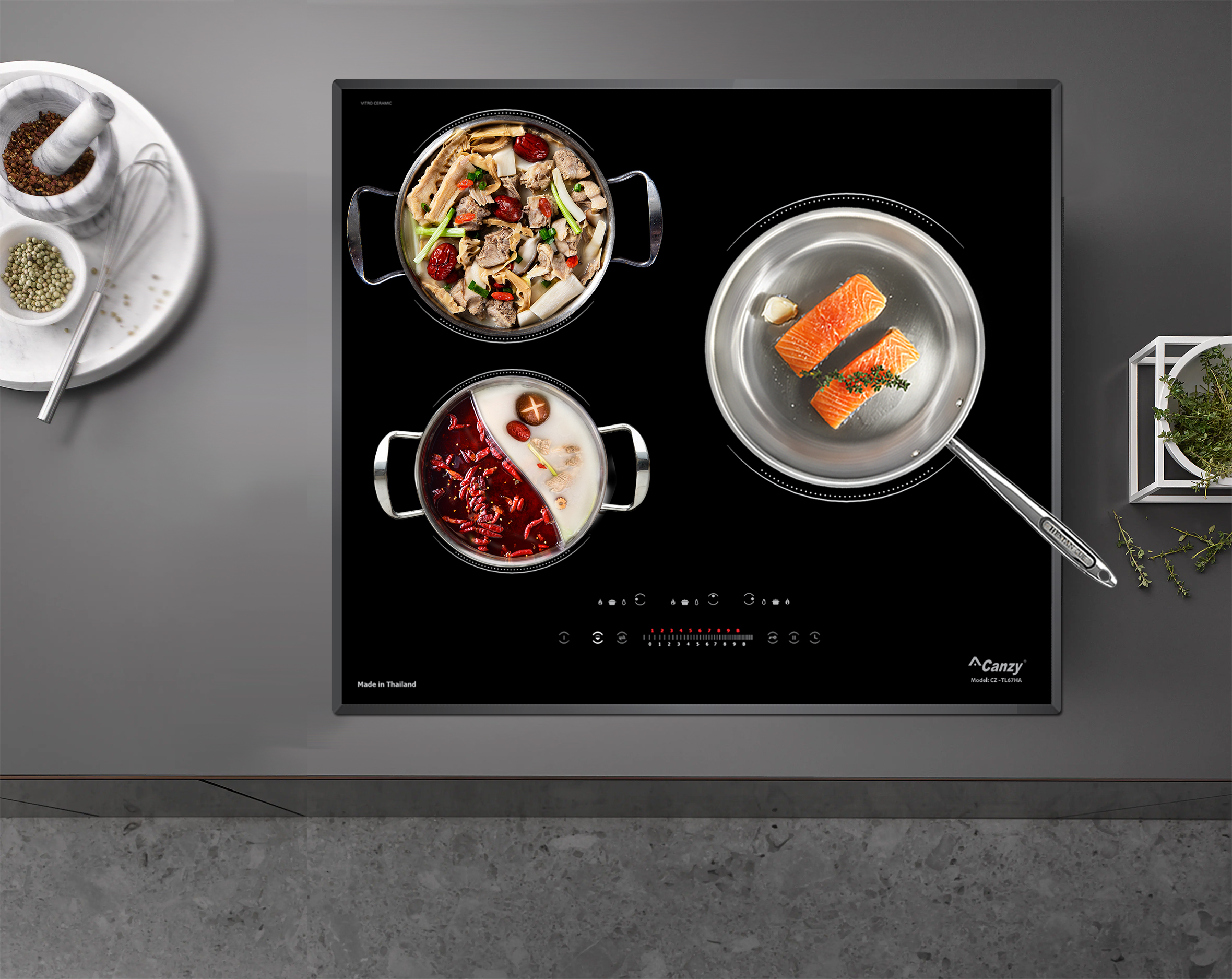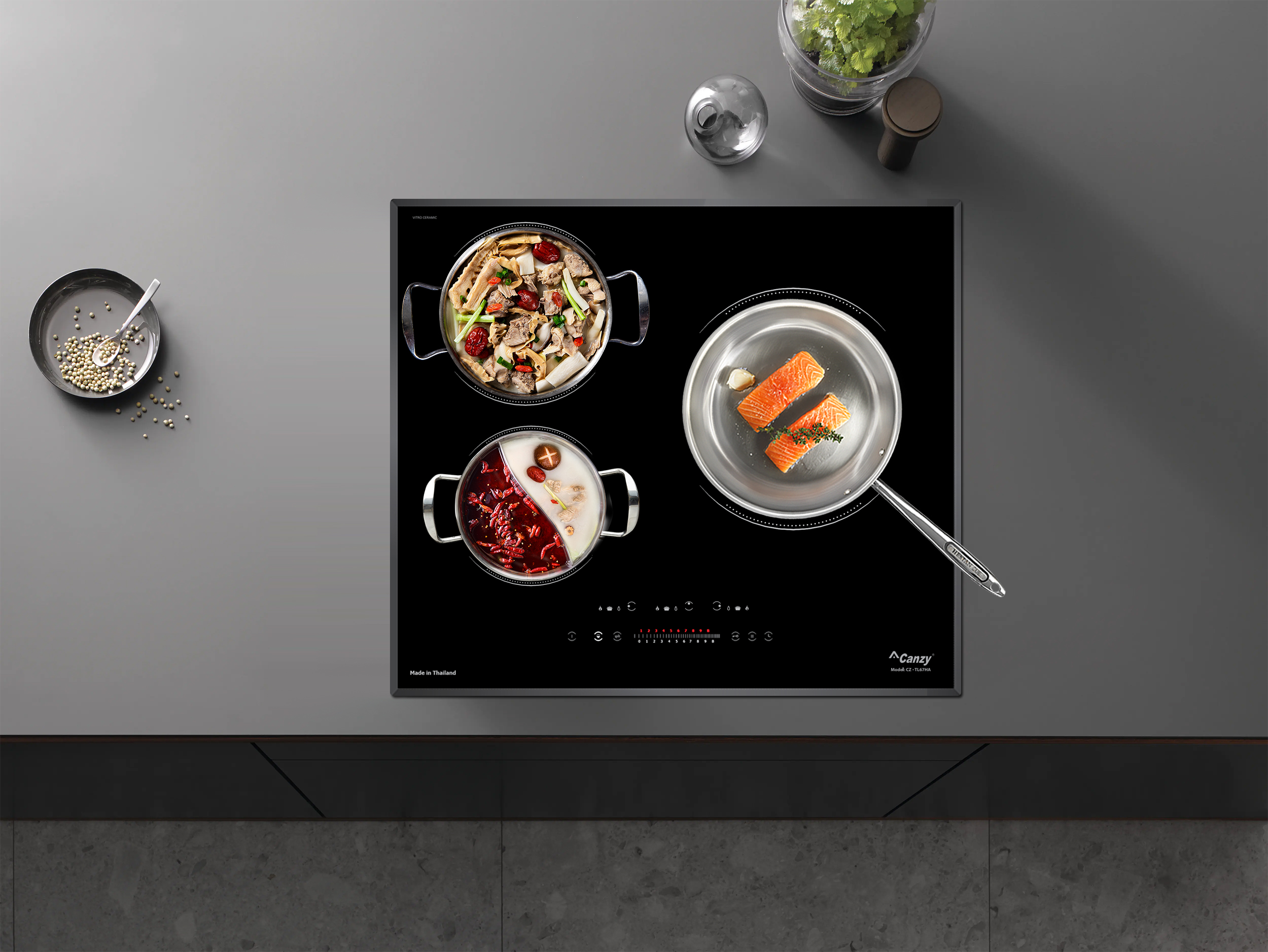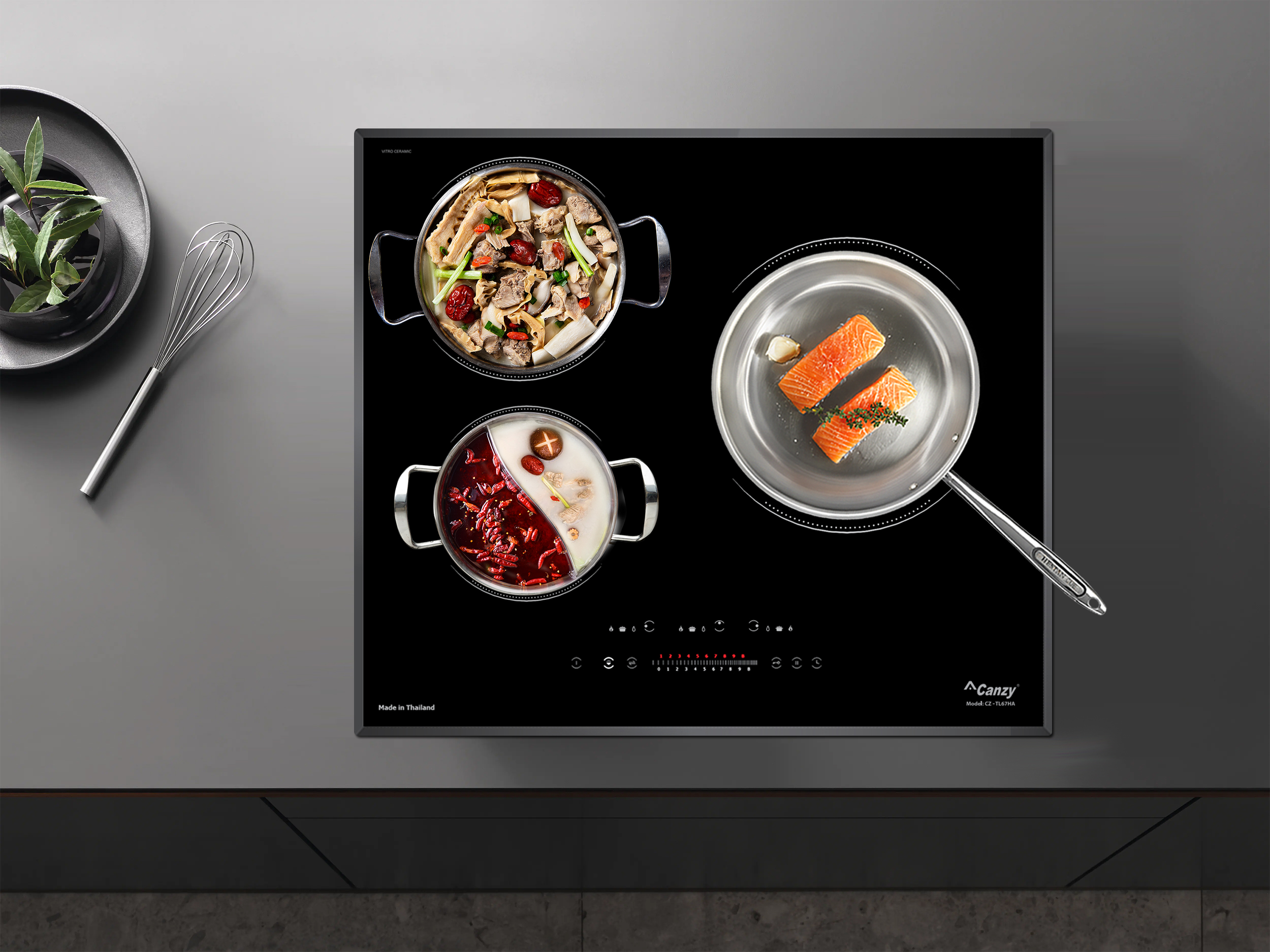 Bảo vệ quá nhiệt (cảm biến nhiệt độ tích hợp trong từng vùng nấu): Bếp từ Canzy CZ-TL67HA được thiết kế cảm biến nhiệt độ dưới mỗi vùng nấu, khi có hiện tượng quá nhiệt ( nồi đun bị cạn, cháy,.. ) bếp sẽ chủ động ngắt công suất để đảm bảo an toàn cho thiết bị cũng như đảm bảo không sự cố đáng tiếc xảy ra.