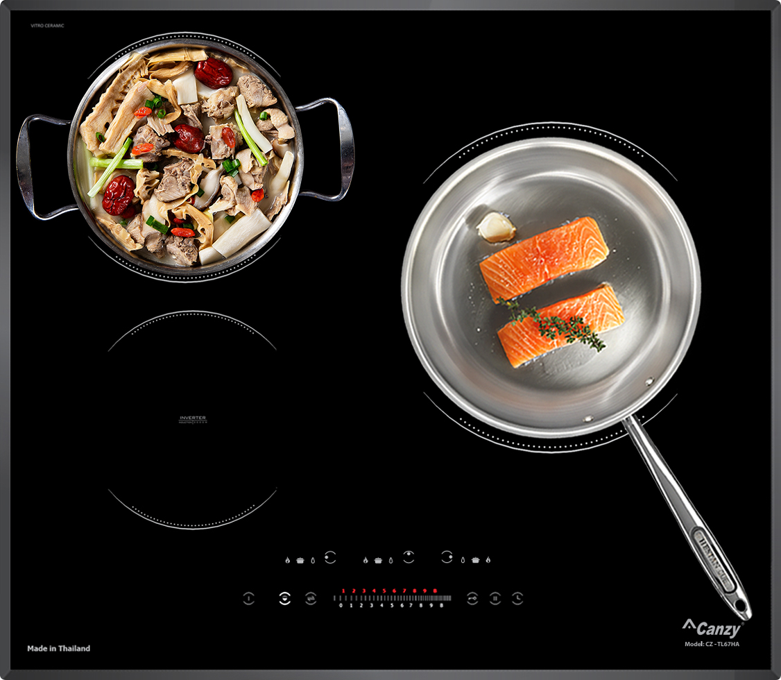 Bếp từ Canzy CZ-TL67HA được tích hợp chức năng tự nhận diện vùng nấu, khi ta đặt nồi lên 1 trong 3 vùng nấu sau đó ấn nút khởi động bếp sau thời gian 1-2 giây bếp sẽ tự động tìm vùng nấu đã có nồi, ta chỉ việc điều chỉnh mức công suất to nhỏ theo ý muốn mà không phải thao tác chọn vùng nấu như bếp thông thường. Công nghệ Half-Bridge Inverter được áp dụng trên bếp từ Canzy CZ-TL67HA có khả năng phản ứng thay đổi công suất theo điều khiển ngay tức thì, khi người dùng điều chỉnh tăng giảm nhiệt độ đun nấu, bếp điều chỉnh thay đổi tức thì về mức nhiệt độ mong muốn.