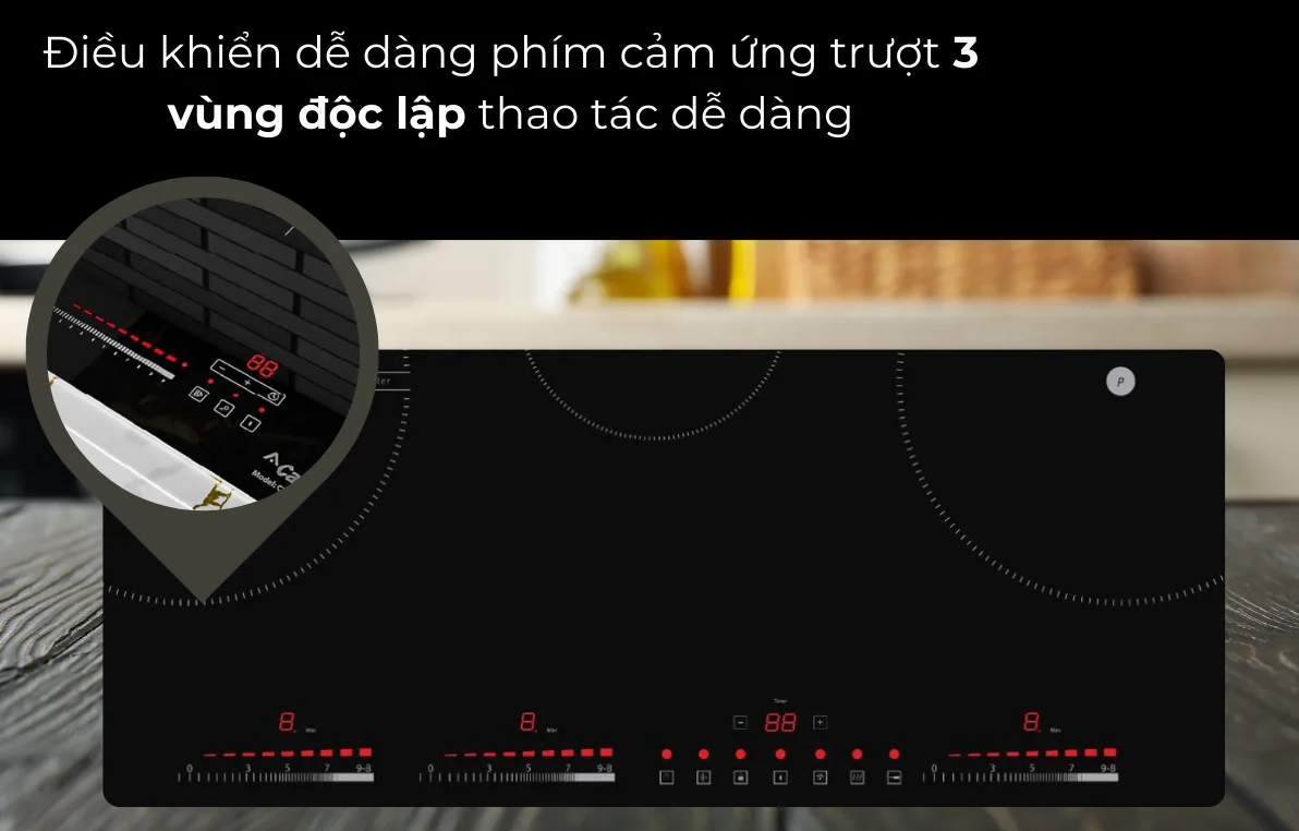 Đây được coi là thiết kế ưu việt nhất cho bếp từ khi người sử dụng có thể dễ dàng và linh hoạt điều khiển hoạt động của cả 3 vùng nấu độc lập cùng lúc. Bộ phím điều khiển được ứng dụng công nghệ cảm biến điện rung bọt biển siêu nhạy giúp người sử dụng dễ dàng thao tác và an toàn.