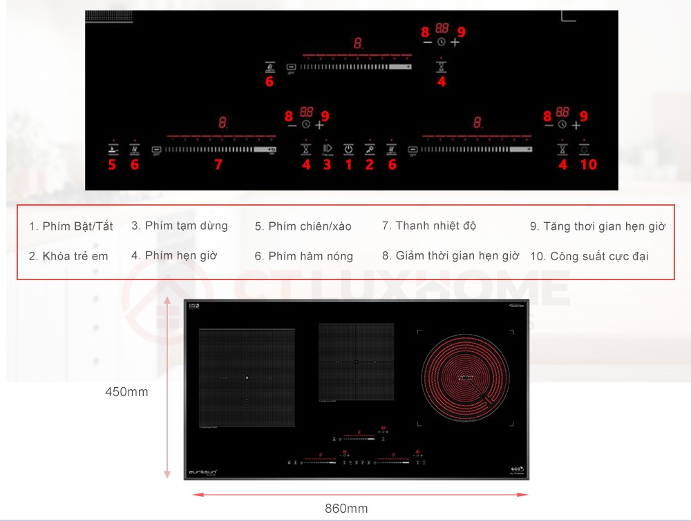 Bảng điều khiển phím cảm ứng trượt Slider siêu nhạy với 9 mức công suất độc lập cho 3 vùng nấu linh hoạt dễ dàng sử dụng, dễ thao tác với cả người cao tuổi và trẻ em