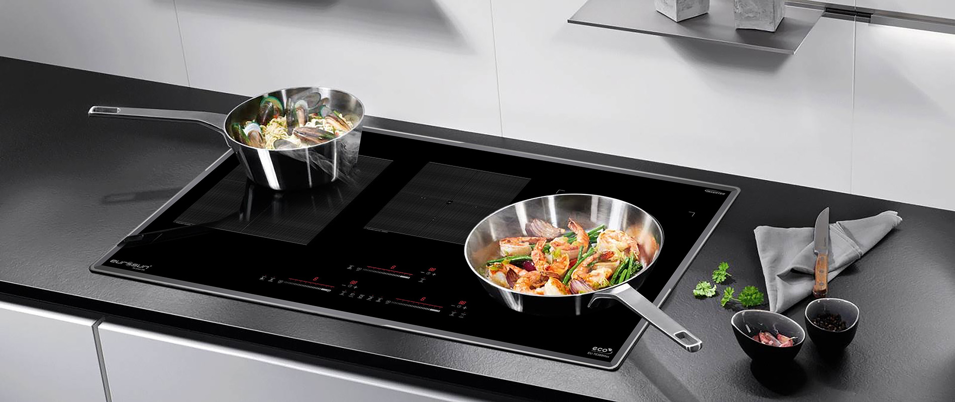 Tự động phát hiện vùng nấu và vùng nấu chỉ nóng lên khi có nồi: Các sản phẩm bếp từ của Eurosun bao gồm EU-TE388Max sẽ chỉ khởi động công suất khi nồi được đặt lên vùng nấu, trường hợp chưa đặt nồi khi đã khởi động, bếp sẽ không đóng công suất và cảnh báo mã lỗi không có nồi hoặc nồi không phù hợp.