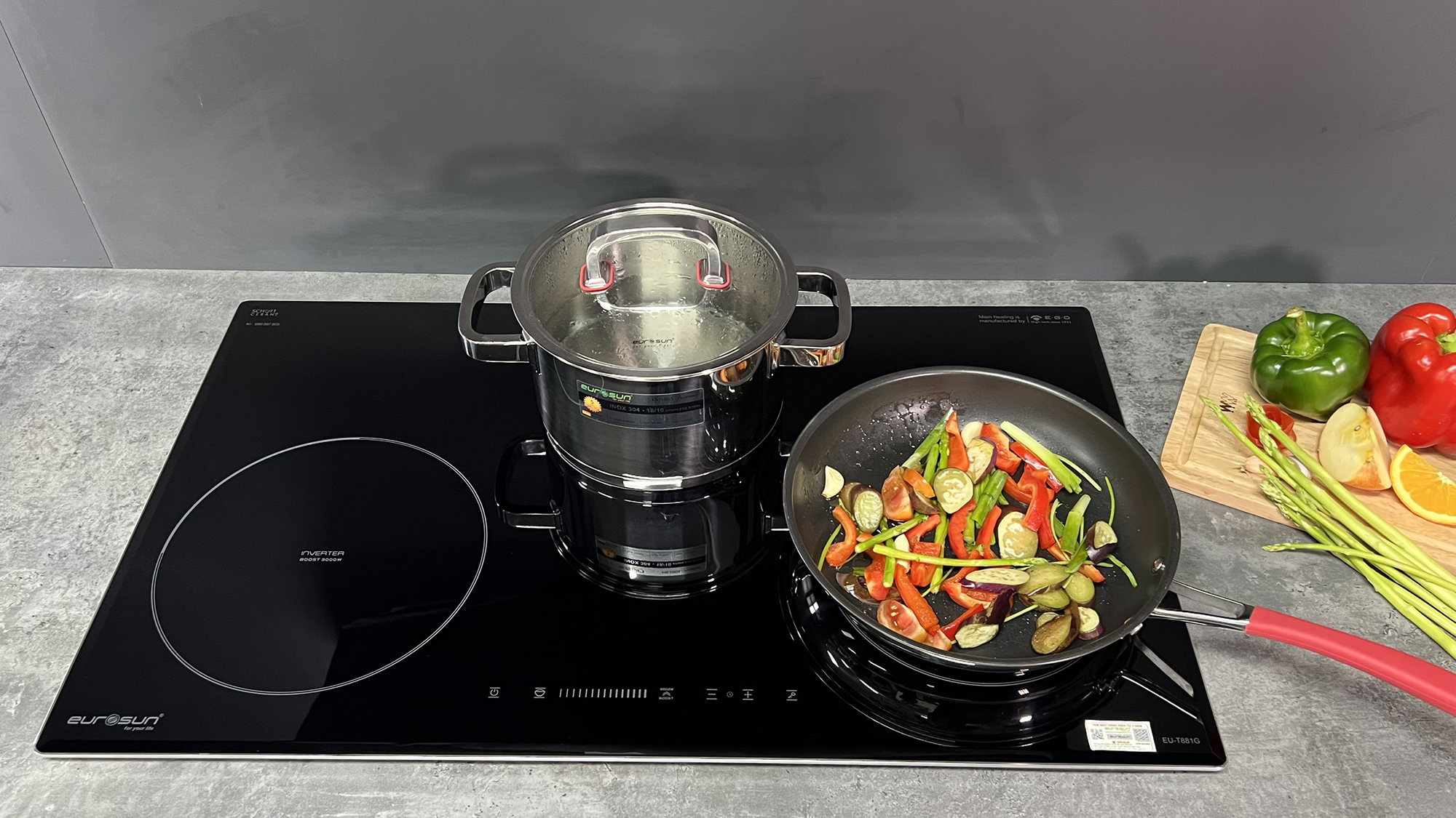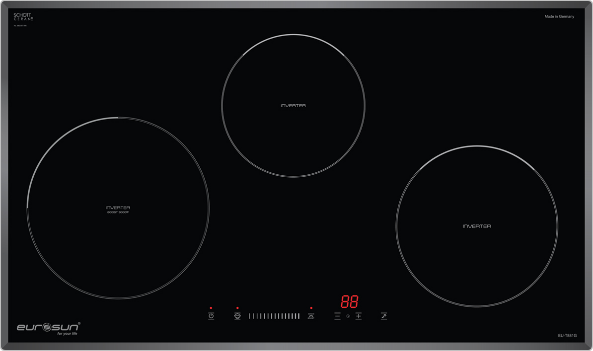 Bếp từ Eurosun EU-T881G là một trong những bếp từ ba ĐẦU TIÊN trên thị trường Việt Nam tích hợp công nghệ Inverter trên 3 vùng nấu. Bếp được trang bị 3 vùng nấu điều khiển độc lập công suất nhưng san tải 5500W nhờ IC công suất thế hệ thứ 4