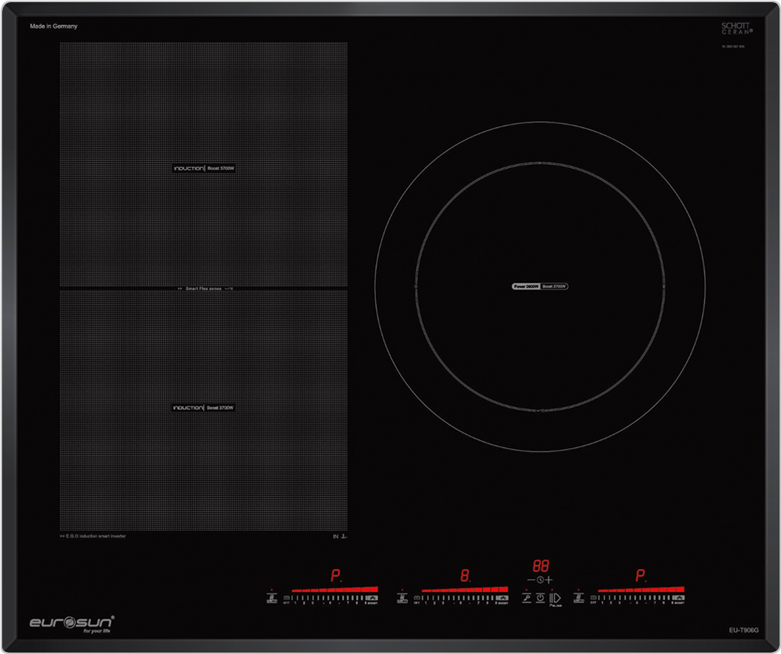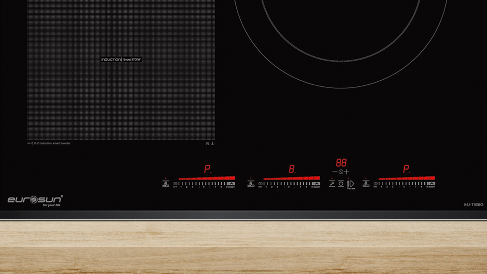Bảng mạch điều khiển của sản phẩm tôi đang giới thiệu với bạn hôm nay sử dụng loại bảng điều khiển EGO Controls Flex Touch (EGO Flex TC) với đặc trưng điều khiển rời cả 3 vùng nấu với chỉ một thao tác tăng giảm duy nhất là kéo Slider. Với lại bảng mạch này có khả năng chịu được đến 105 độ C và chỉ tiêu thụ có chưa đầy 0,5W/h rất tiết kiệm điện. Đồng thời nó cũng được lập trình nhiều tính năng nấu thông minh, tạm dừng… tương lai Eurosun có thể sẽ có những bản nâng cấp khác.