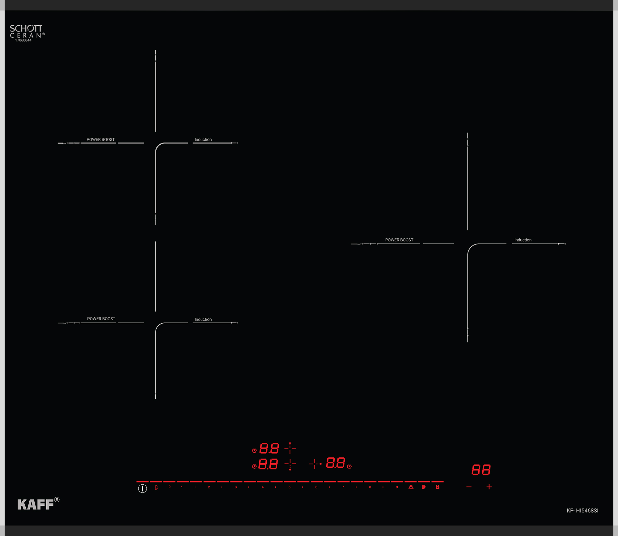 Bếp từ Kaff KF-HI5468SI gồm 3 vùng nấu với tổng công suất 5600W. Vùng nấu trái trên có công suất 1800W khi kích hoạt tính năng nấu nhanh Booster công suất lên tới 3200W. Vùng nấu trái dưới có công suất 1200W khi kích hoạt tính năng nấu nhanh Booster công suất lên tới 1800W. Vùng nấu phải có công suất 2600W khi kích hoạt tính năng nấu nhanh Booster công suất lên tới 4300W. Chỉ trong chốc lát sau khi kích hoạt tính năng này, nhiệt lượng trên vùng nấu từ tăng lên công suất tương đương với mức nhiệt lượng lớn nhất. Do đó, các món ăn được nấu chín nhanh hơn, tiết kiệm thời gian vào bếp cho chị em nội trợ. Chức năng Booster nấu siêu nhanh, tuy nhiên thời gian tối đa mặc định dùng chức năng này là 10 phút / lần tránh quá tải.