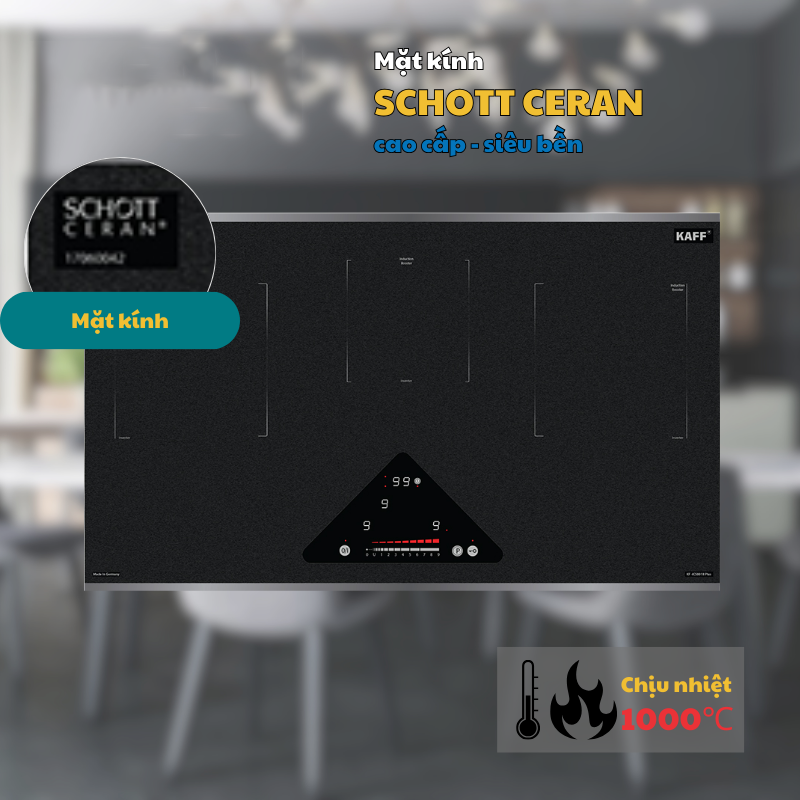 Bếp từ Kaff KF-IC5801II Plus không chỉ là một thiết bị gia dụng mà còn là một món đồ trang trí, góp phần tô điểm cho không gian bếp của bạn. Mặt kính Schott Ceran Made in Germany siêu bền, chịu lực và chịu sốc nhiệt, không chỉ mang lại vẻ ngoài sang trọng mà còn đảm bảo độ bền bỉ theo thời gian. Kích thước mặt kính 780R x 450S mm và kích thước cắt đá 750R x 380S mm phù hợp với nhiều không gian bếp, dễ dàng lắp đặt và sử dụng.