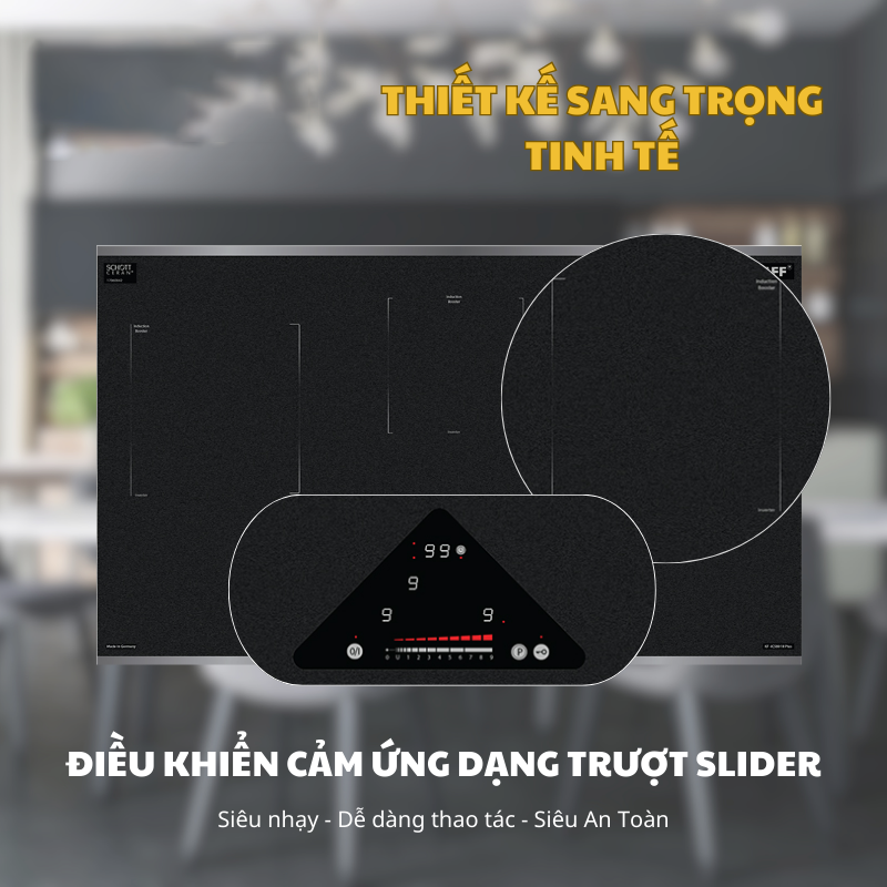 Bếp được trang bị bảng điều khiển cảm ứng dạng trượt Slider hiện đại, dễ dàng điều khiển và điều chỉnh các chức năng. Với 9 dãy công suất + Booster, bạn có thể dễ dàng điều chỉnh nhiệt độ phù hợp với từng món ăn. Chức năng Booster giúp tăng cường công suất nấu nhanh chóng, tiết kiệm thời gian nấu nướng.