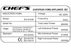 – Bếp từ Chef’s này có 3 vùng nấu với tổng công suất tối đa 6800W khi bật 3 bếp cùng lúc, nấu được nhiều món, tiết kiệm thời gian.