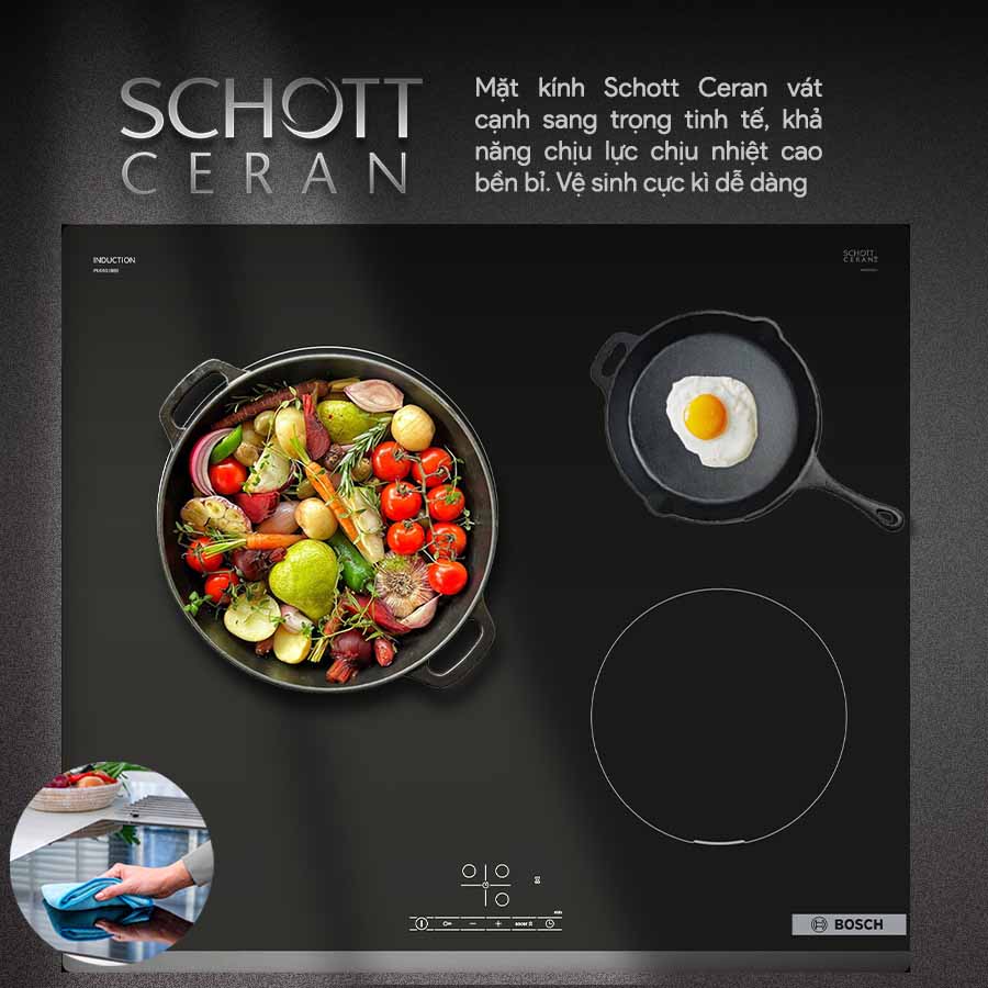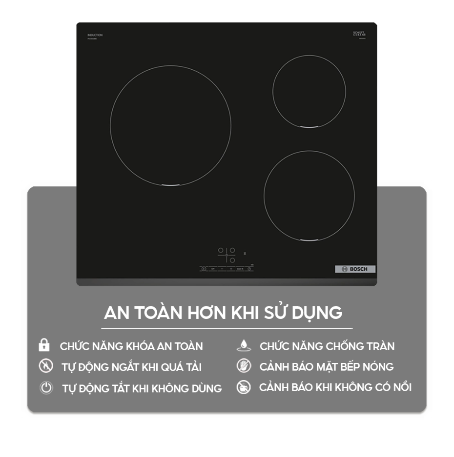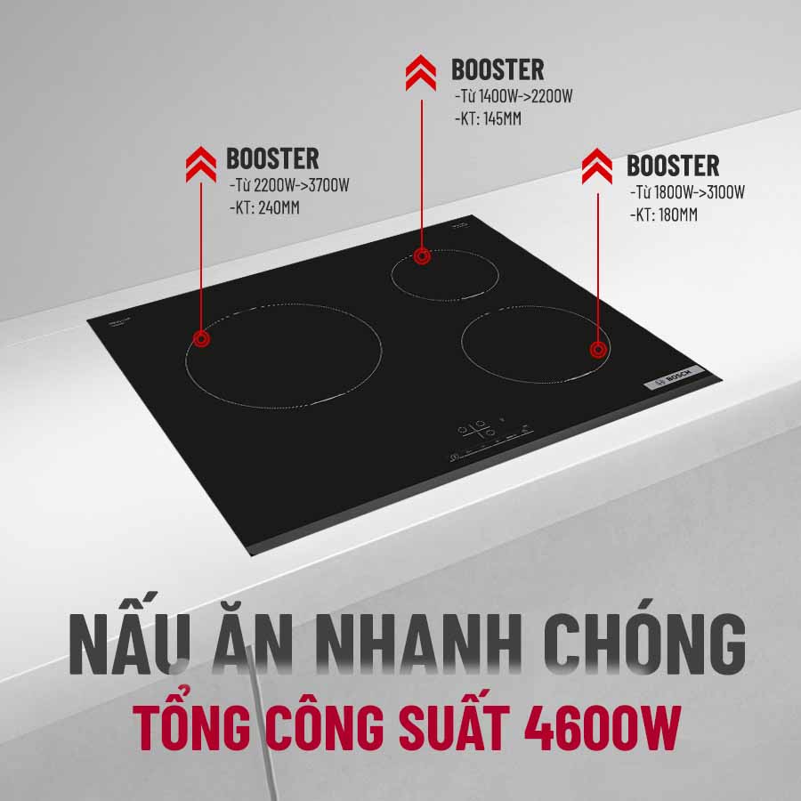 – Bếp từ Bosch có tổng công suất 4600W, trang bị tính năng Booster làm nóng nhanh.