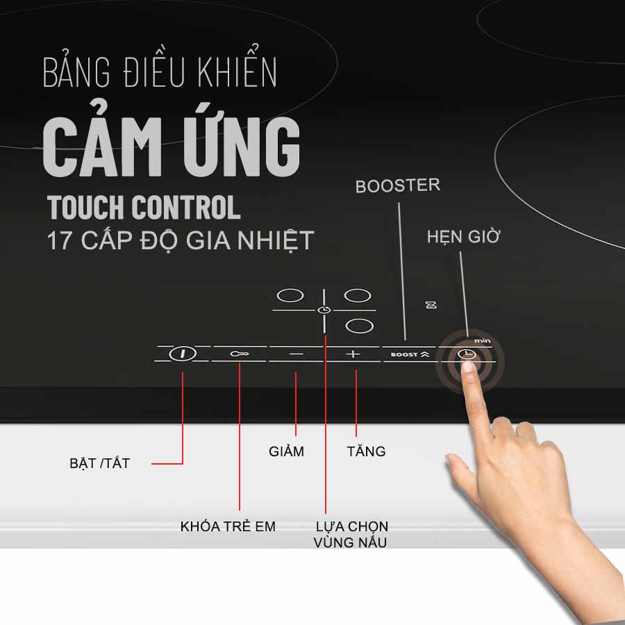 Bếp từ 3 vùng nấu thiết kế màu đen sang trọng, hiện đại, có thể lắp âm (cần CB), nấu được cùng lúc nhiều món, rút ngắn thời gian nấu tối đa.
